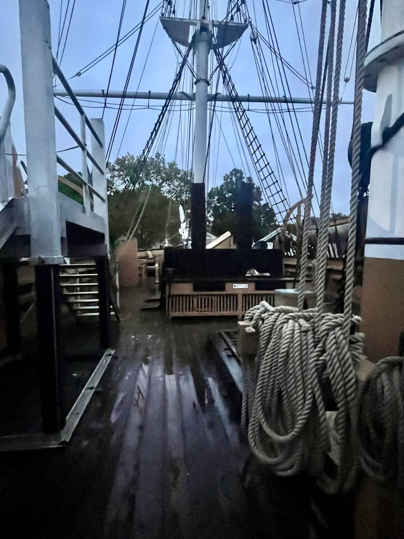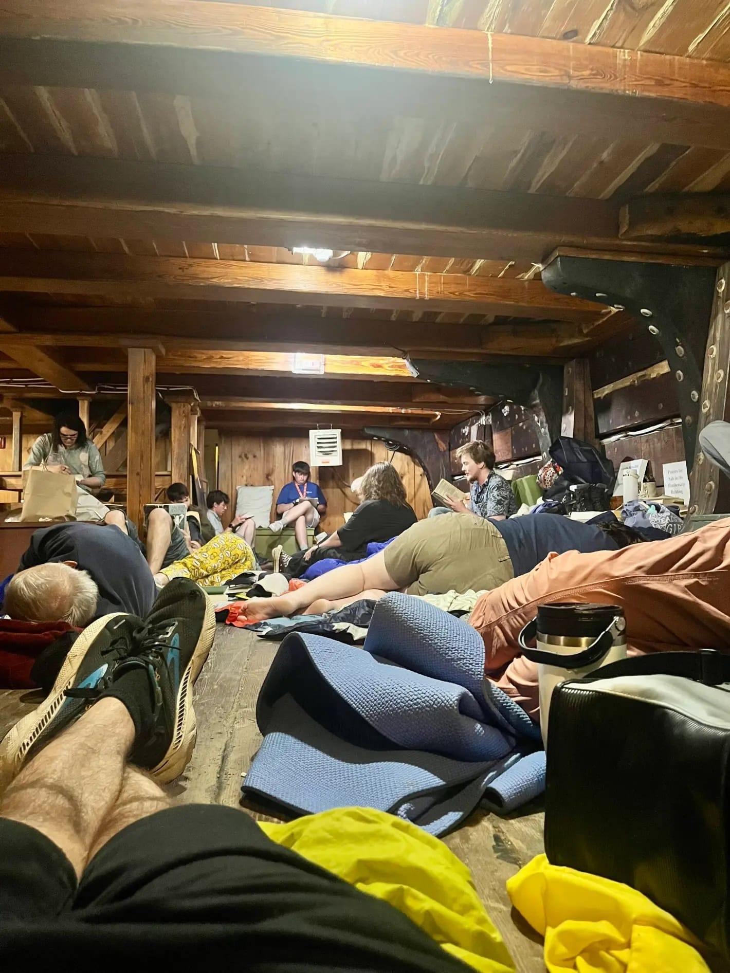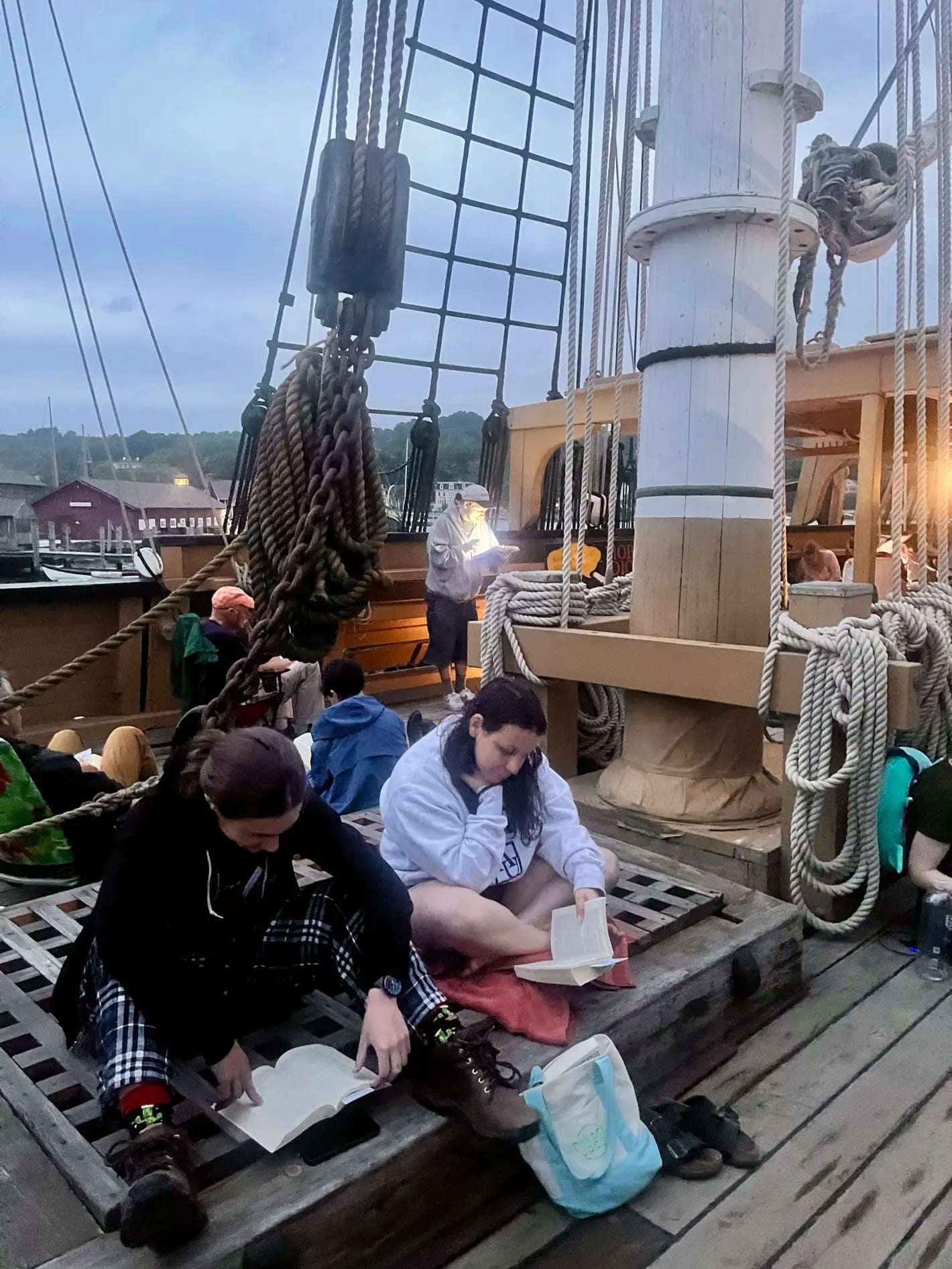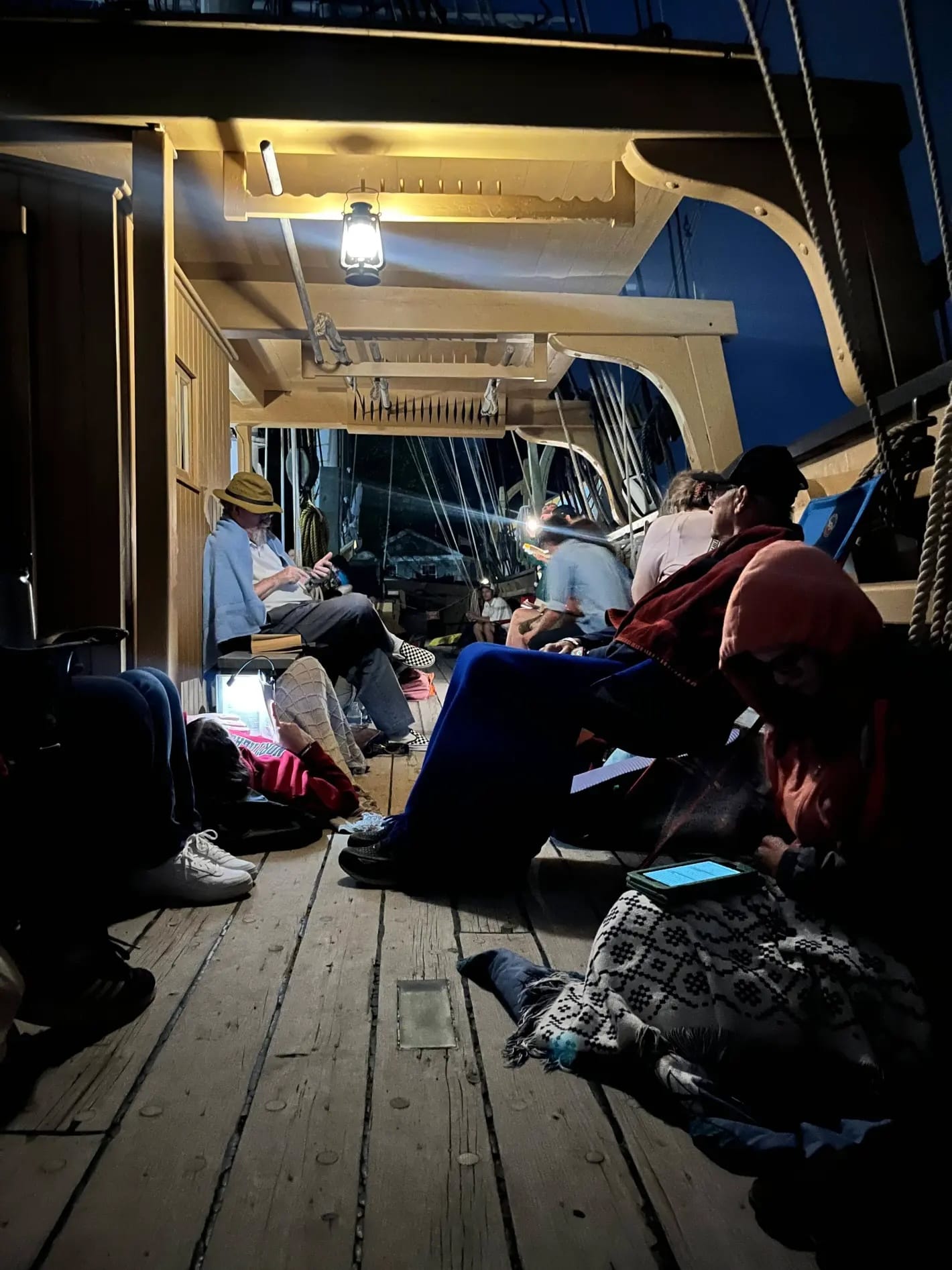 I was relieved when the organizers announced we were moving the reading inside the Morgan to get out of the weather. I navigated the narrow stairs down to the ship’s blubber room, a long squat compartment in which most everyone would bang their heads on the ceiling beams during the night, even me who was too short to reach them. It was warm down here, and well-lit, and knowing I wouldn’t be too cold or my flashlight wouldn’t die helped me chill out. I staked out a corner among some barrels, shamefully posted about it despite my vow to keep off the internet, and tried to arrange myself away from the rain burbling through the ceiling.