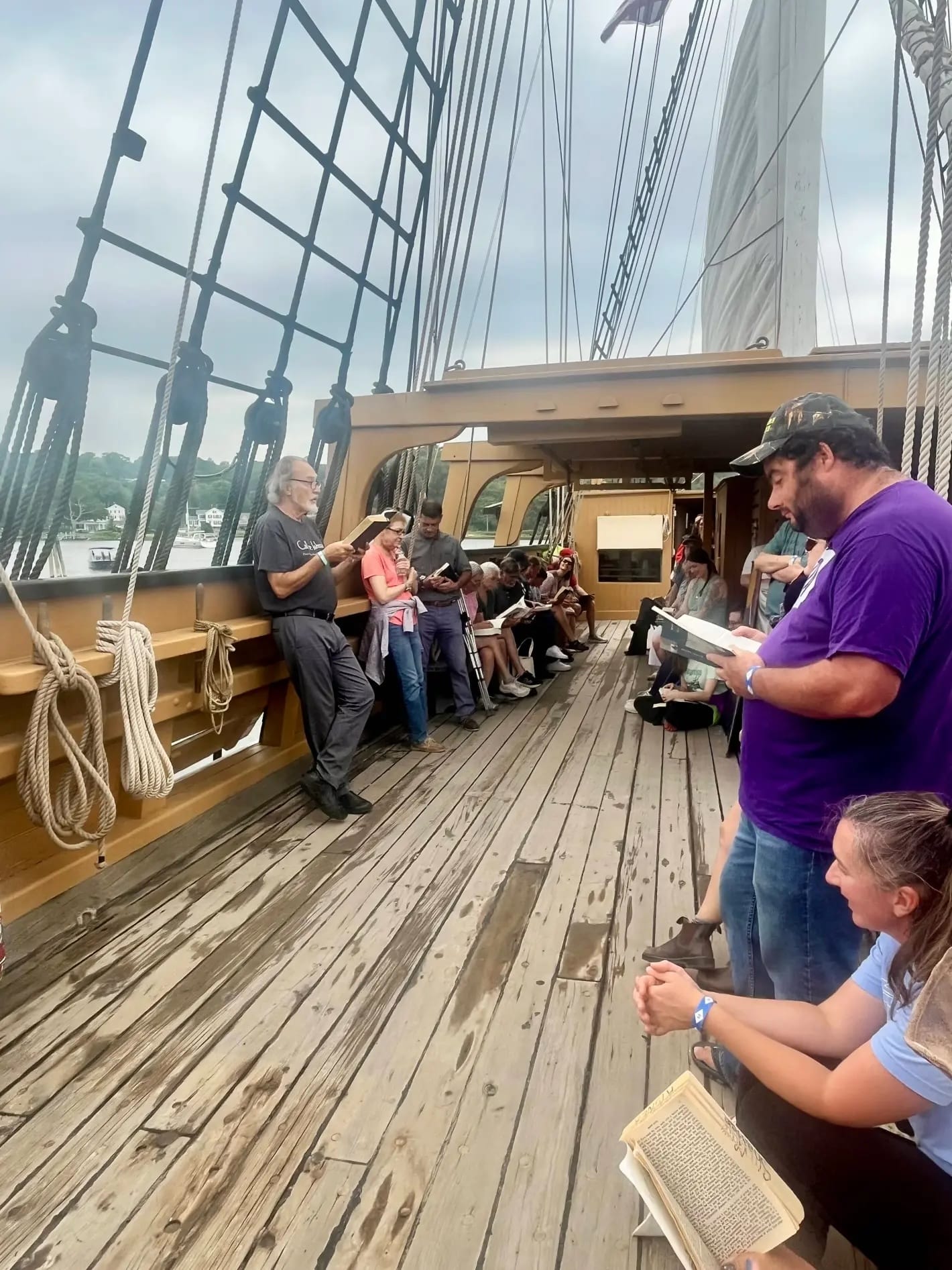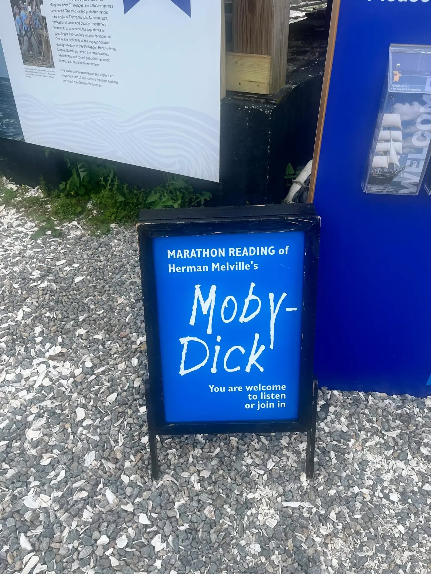 Back on the Morgan, we alternated between reading along, listening, and getting to know the people around us. We fell in with two folks whom I later learned had just met that day by sitting next to each other; one of them was here for the fourth time and had stayed overnight twice in the past, though was spending the night in her bed in Mystic for this one. She and her husband, I learned later, had both been editors at a prominent running magazine (she told me I “looked like a marathoner” when I turned the subject to running, a thrilling compliment) who’d retired to the town. Along with some friends she’d adapted short versions of classic books, including Moby Dick, a copy of which she presented to the organizers at the end. During a break for people to get things from their cars, she told me, with what I read as the love of suffering of a distance runner, that there had never been breaks in the past. But I could understand the desire for it; it felt rude to wander in and out while people were reading, but it was also hard to sit quietly for that long, reading Melville’s winding prose, and the hard deck of the Morgan and the muggy weather didn’t make it much easier.
