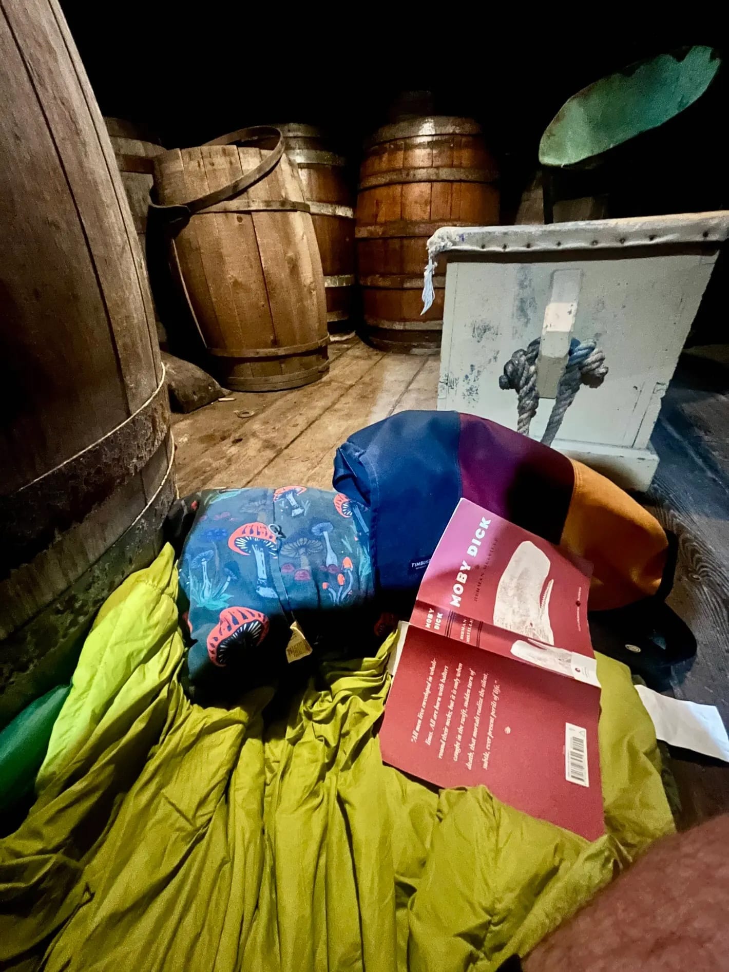 I built my stuff into a little nest among the barrels, using my raincoat as a levee against a growing puddle, and laid down to follow along. Eventually, I decided to nap for a chapter until the applause for a finished reader woke me, read along for a chapter, and then nap for another. These arrhythmic gulps of sleep were less restful than I expected, still believing I could stay up all night like I used to before I hit my 40s. I had to keep contorting myself into a narrowing strip of dry floor as the rain found new gaps in the ceiling. Meanwhile, Moby Dick just kept going, the pace of different people reading aloud far slower than my own reading speed and making me feel like we’d be trapped in it forever.