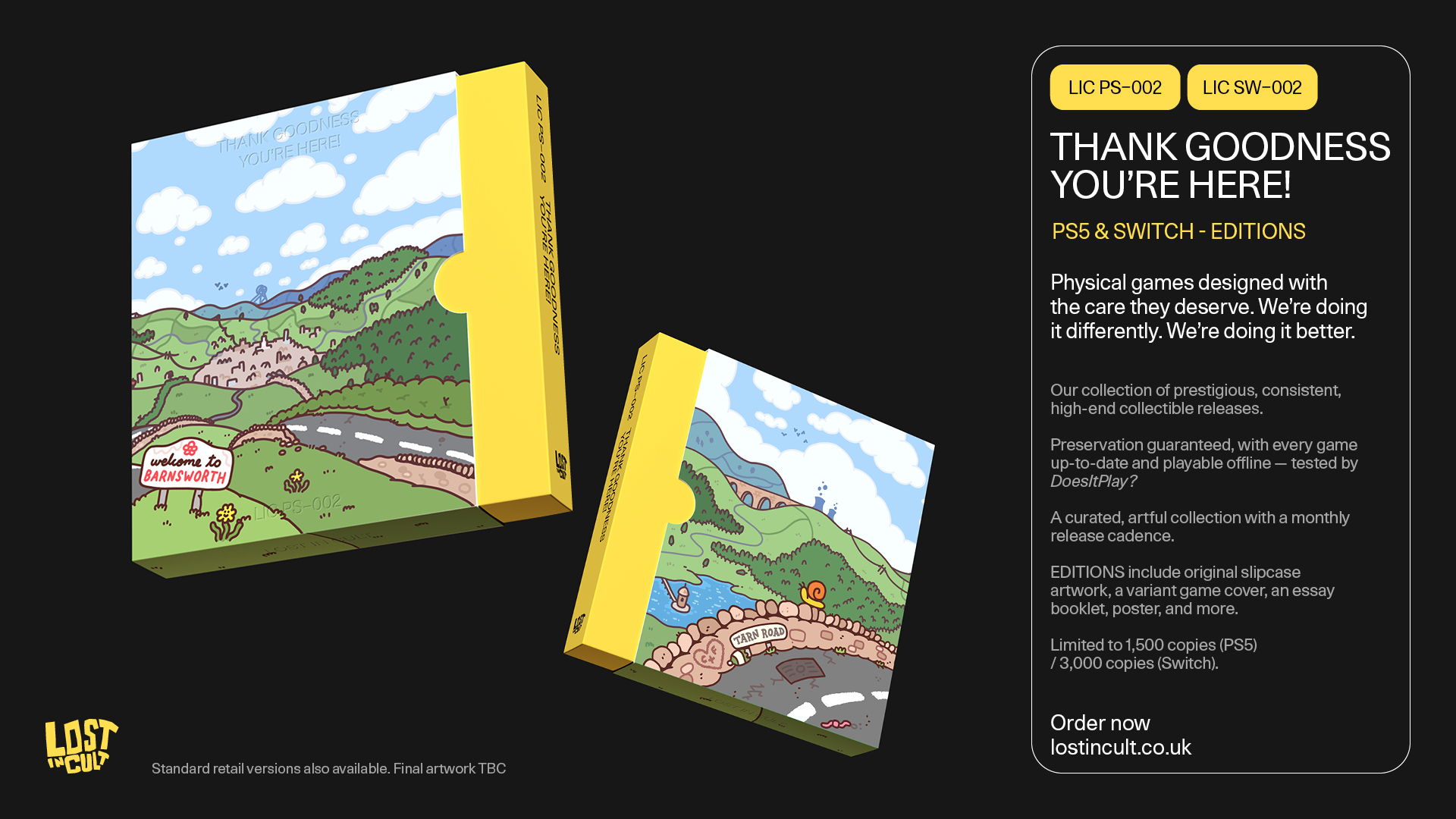 Lost In Cult say that every game that they release--and the initial run includes Immortality, The Excavation Of Hob's Barrow and the wonderful Thank Goodness You're Here--is being run by DoesItPlay?, "a group that tests physical releases to determine their playability for the future", and that all the material they're creating, from posters to booklets, is being shared with "multiple museums and archive groups".