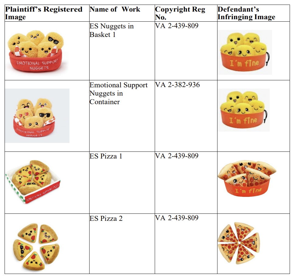 What Do You Meme alleged in the complaint that Song intentionally copies its plushies and confuses potential buyers by using the emotional support label. What Do You Meme wrote that it submitted a Digital Millennium Copyright Act takedown notice in June, but that Song submitted a counter notice, which allows the products to go back up on Amazon. What Do You Meme is looking for $150,0000 per copyright infringement; it cites ”no less than four,” making that amount at least $600,000. It also wants the alleged copycats taken down.