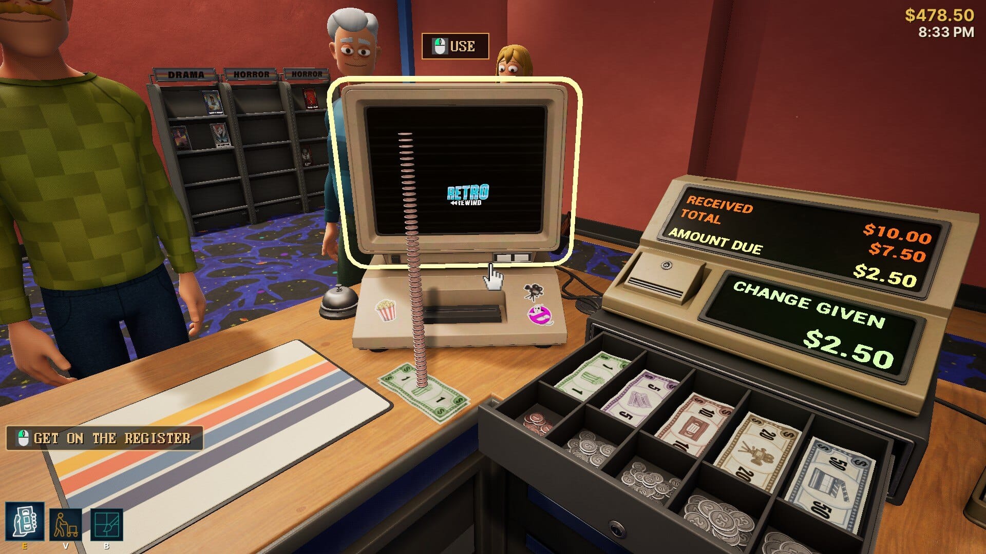 As you level up, you unlock new movie genres or the ability to repair your slushee and popcorn machines, and can use your earnings to upgrade the size and layout of your store. I just hired my first employee, who’s already been a big help dealing with the returns so I can run around a little less. I’m still in the game’s early stages, but I don’t think I’ll want to outsource everything to employees; at the least, I’d miss all the lovely beeps and dings that accompany my daily tasks.
