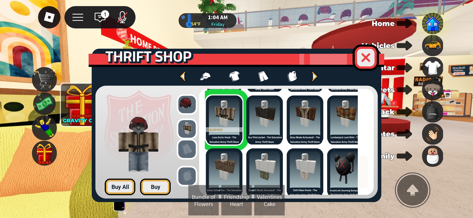 You can't really thrift, per se, in Roblox, but players can submit clothing designs to be uploaded onto digital clothing racks. On each of my visits, there were a lot of the same designs; they don't appear to be exclusive or one-offs, like it would be in a real-life thrift store. (Players can upload their designs on the Thrift Score website, but can't donate in-store.) The wearables are apparently discounted, but Roblox purchases are often quite cheap already. The stuff I saw was around 5 Robux or so, which is just a few cents worth of the currency.