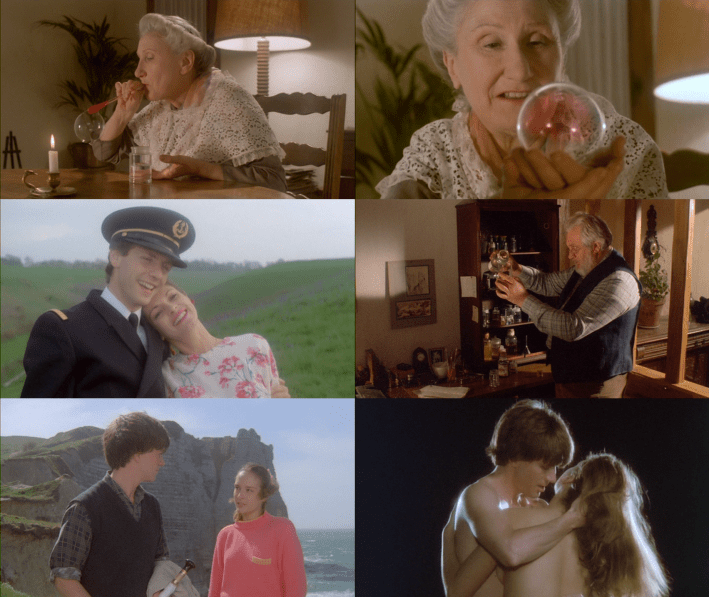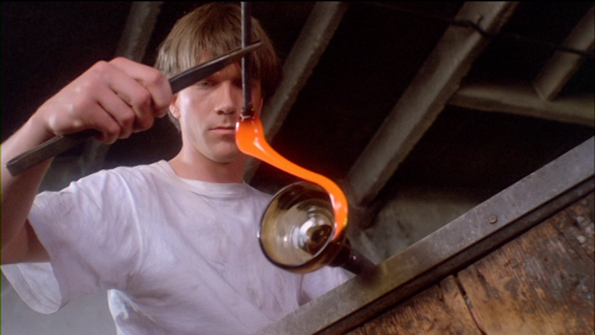 It’s the story of an old man named Joseph who sells people the ability to relive their memories (the sign outside his shop reads “Chez Joseph Souvenirs”). He does this by mixing a potion that they use to blow a soap bubble, which then crystallizes into a precious, bittersweet memory from their past. An old woman remembers seeing her child off on a boat, who then subsequently died in a shipwreck. Another woman fondly relives a memory of frolicking in the flowers with her love, who died in combat. Eventually, a man named Tom (Philipe Caroit) darkens Joseph’s door, and at the old man’s suggestion relives the courtship with his long lost love Marie. Tom is a simple country boy who dreams of being a glass blower, and Marie’s adopted family are upper crust and do not approve. Tom goes to Venice to study glass making, only to be betrayed by one of his close colleagues. If you only watch one part of this movie, it should be the scene in the middle where Tom does really elaborate glass blowing for several minutes. When he returns, it is revealed that Marie has been pining for him, reliving her memories, the same way Tom has been for Marie. The two reunite, and embrace.