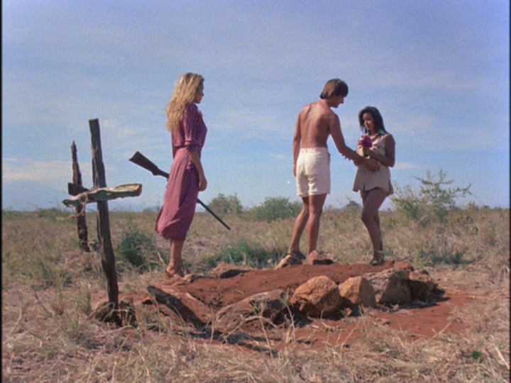 Eventually this tranquility is disrupted by an amnesiac British plane crash survivor, played by Philip Sayer, who wanders into their life and falls in love with Stewart's granddaughter. Soon the amnesiac’s fiancé attempts to track him down. Stewart’s health deteriorates, and his conflicts with local poachers escalate. Eventually the fiancé tracks the amnesiac down at Stewart's grave, attempting to give him his old dart gun and return him home. The amnesiac refuses, stating that this is his home now. As he walks away, his fiancé shoots him. In the next scene, which feels suddenly tacked on, he’s made a complete recovery. From context, I would guess that the original vision for this beat was much darker.
