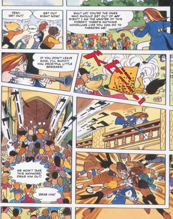 This is the part where the manga and the film diverge wildly. In the movie, the Baron is depicted as a Dracula-like figure, who turns the animals evil with magic and who Unico must confront in a surreal confrontation that would be terrifying to watch as a child. In the manga, the Baron Ghost is an evil aristocrat who takes pleasure in killing animals for sport, hanging their heads on the wall as trophies. Unico solves this by turning all the animals in the forest into people and having them storm the Baron’s castle, tearing him apart in a proletariat rage. While I find that ending cooler and much more cohesive, I can see why they went the big scary monster route for the movie.