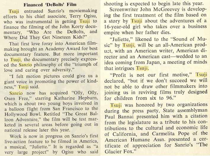 I have watched almost all of them, and I am here to tell you about them, in more or less chronological order. The output paints a picture of Tsuji as a man who wanted to become Walt Disney by force. One of the given explanations of the company name “Sanrio '' is itself a California dream: a portmanteau of the words “San'' as in San Francisco and “Rio '' as in river. Tsuji would travel to Walt Disney Studios in Burbank in the mid-70s, and while there introduce himself as “Japan’s Disney.” The company would eventually launch an ambitious $50 million dollar, self-distributed push into film. One film distributor in 1978 was skeptical: “It’s extremely difficult to market animated films unless you’re Disney. They’re going to get killed.”