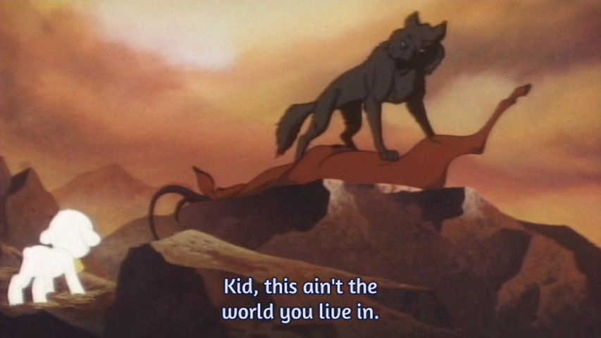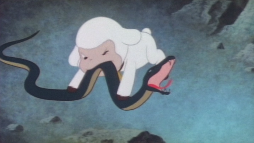 Ringing Bell is one of the most severe children’s movies in history, in the same category as Watership Down and The Secret of NIMH. Like the previous two entries, it is adapted from a book by Yanase. The movie stars Chirin, a little lamb with a little bell. Chrin’s lamb mom warns him never to go beyond the fence, because beyond there is a wolf named Woe who wishes to feast on the flesh of the lamb.