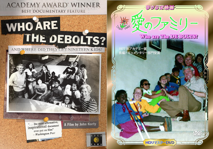Who Are The DeBolts? And Where Did They Get 19 Kids? is technically the first feature length theatrical release that Sanrio ever financed, co-produced with Charles M. Schulz Creative Associates. Adapted from 19 Steps Up the Mountain: The Story of the DeBolt Family, the documentary tells the story of Dorothy DeBolt (previously Dorothy Atwood), who bore five biological children and adopted two Korean children with her husband in her first marriage. Her first husband passed from cancer fairly young, and following his death she adopted two additional children, this time from Vietnam, both of whom had disabilities. Eventually she met and married Bob DeBolt, who had one daughter from a previous marriage. The couple went on to adopt 10 more children, many from various backgrounds and many of whom had disabilities.