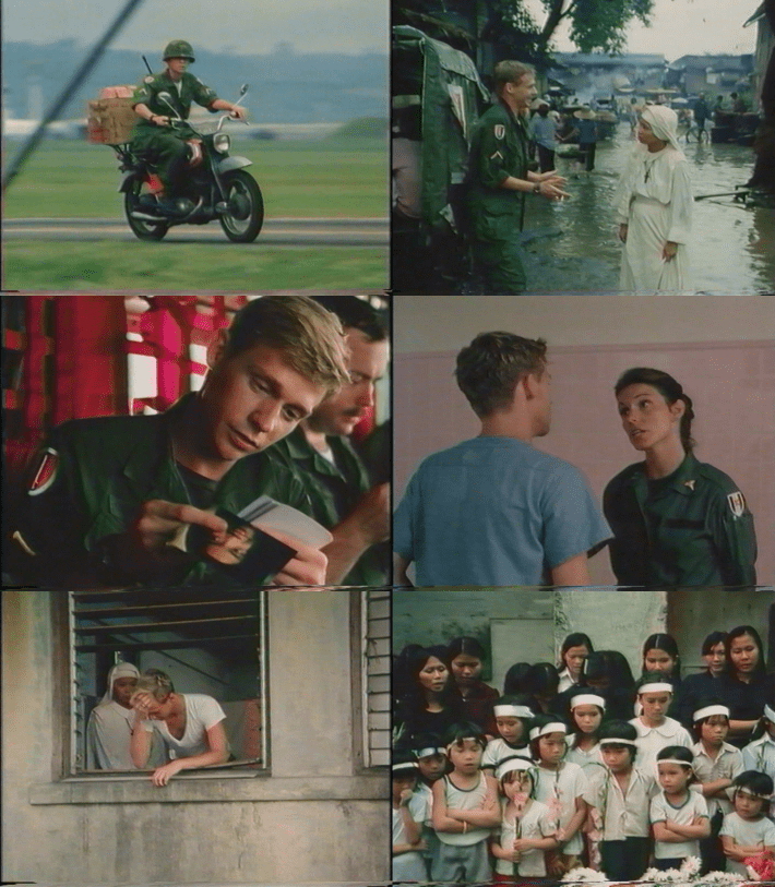 A dying soldier in the Vietnam War asks a medic named Brian, played by Dennis Christopher, to care for a Vietnamese girl he pulled from a combat zone on to a helicopter. Brian ends up becoming the sole benefactor of an orphanage run by Catholic nuns who cannot keep up with the endless flow of children orphaned by the bloodshed. Brian helps by stealing supplies from the military base he’s stationed at, which in this movie’s defense is one of the cooler things you can do while in the military, which is portrayed as a comically corrupt institution. Don’t Cry, It’s Only Thunder is relatively neutral on the topic of the war itself, depicting it almost as a force of nature rather than something the main character is complicit in as a medic, although one of the nuns condemns America to Brian’s face for its role in perpetuating the war. Additionally, most of the Vietnamese people in the movie are either innocents saved by Brian during his personal journey, or broadly drawn stereotypes of enemy Vietnamese combatants (one of whom smuggles a bomb in a basket of puppies to place in a GI’s jeep). Probably the most human interaction in the movie involves Brian attempting to escape the military on a motorcycle, crashing, and being quickly hidden by an elderly florist who knows him for helping the orphanage, but even this interaction is done in a slapstick “hey buddy, you’re all right” kinda way.