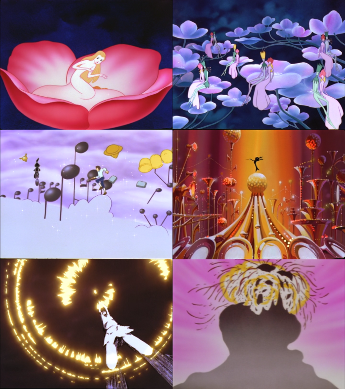 Having whiffed it on an earlier attempt to bring Fantasia to life with Winds of Change, Sanrio took one last shot at it with A Journey Through Fairyland. Once again directed by Masami Hata and written by Shintaro Tsuji, it’s the story of a young, absent-minded boy studying the oboe who loves playing music for flowers. One day he rescues a begonia he finds on the ground, and the spirit of the flower, a fairy named Florence, brings him on a fantastical journey through Flowerland. Save for a single song (a love song by Florence) the entire movie is set to orchestral music. The plot is really the least important part of this movie; like Fantasia, the entire point is to see incredibly complex animation set to classical music. You got Strauss, Beethoven, Schubert, Bach, Mozart, Brahms, Tchaikovsky, and more. There are also a few numbers done by composer Naozumi Yamamoto, who is known for scoring the Tora-San movies – a series about a lovable vagabond who strikes out with the ladies that has, I am not joking, 48 installments (for context, there are currently 26 James Bond movies).