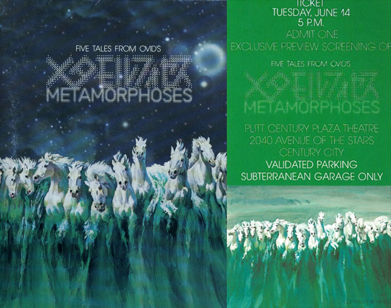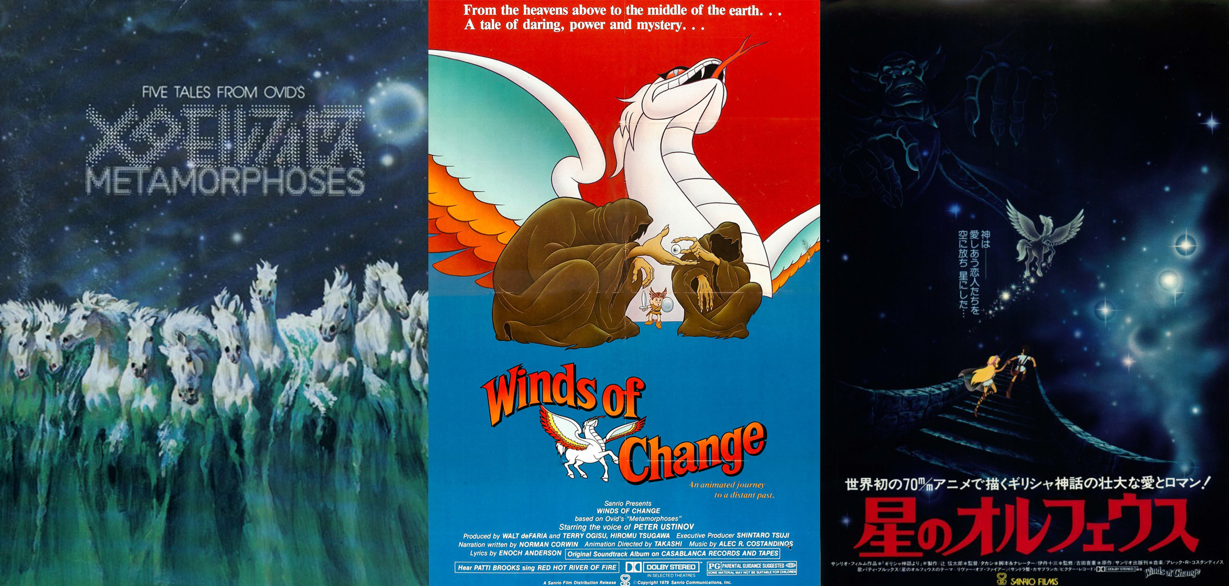 Metamorphoses bombed hard. Viewers were not familiar with Ovid, and did not understand why the same character was reprising the same roles, because there was no narration or explanation to contextualize it. The animation was jerky and uneven. Even a Sanrio spokesperson later admitted that the film in its original form was “incredibly difficult” to understand. Cartoon historian Fred Patten attended a screening in Century City, where attendees were given limited edition posters by artist Mo Gollub (an artist most famous for his covers of Turok and Tarzan); to quote Patten, “The orchestral pop-rock music was so deafening that it literally drove some of the audience out of the theater. It was rumored that it was so loud that plaster was flaking from the ceiling, while Takashi was complaining, ‘Can’t you turn up the sound any louder?’”