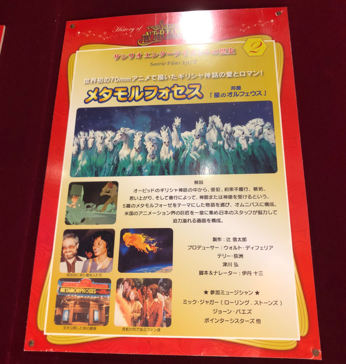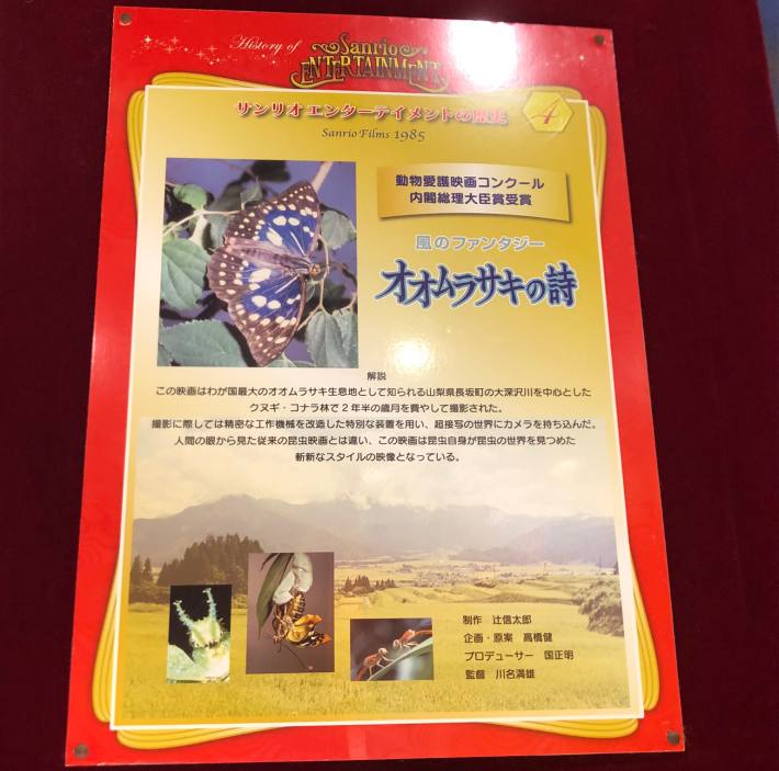 One person who has been instrumental in this article, A Sanrio blogger who goes by pinky1030rocks on Twitter, sent me photos of their recent trip to Sanrio’s theme park: Puroland. In Puroland, there is a small display case dedicated to Sanrio’s film accomplishments. On display are several movies that are well known: Who are the DeBolts?, Metamorphoses, The Sea Prince and the Fire Child, and then one other I had not seen: a documentary from 1985. Seemingly titled Fantasy of the Wind: Ōmurasaki’s Poem, it appears to be a nature film about the Japanese butterfly sasakia charonda or Great Purple Emperor (known in Japan as ō-murasaki or great purple) shot over several years in Yamanashi prefecture. This all scans, as Hokuto City has an entire wildlife refuge dedicated to the Ōmurakasi butterfly, and Shintaro Tsuji himself was born in neighboring Kōfu. I cannot find any other information about this movie, but I hope to watch it one day.