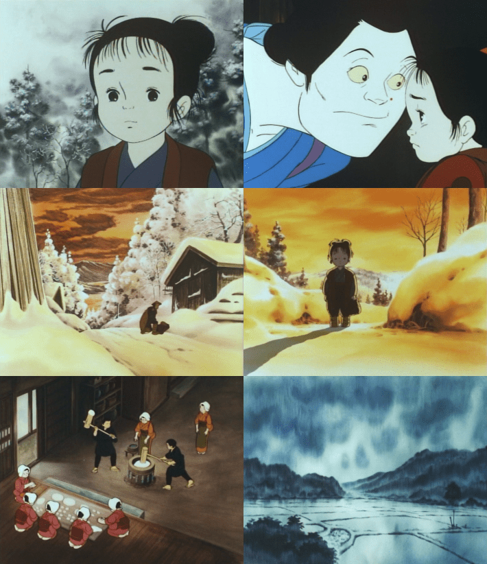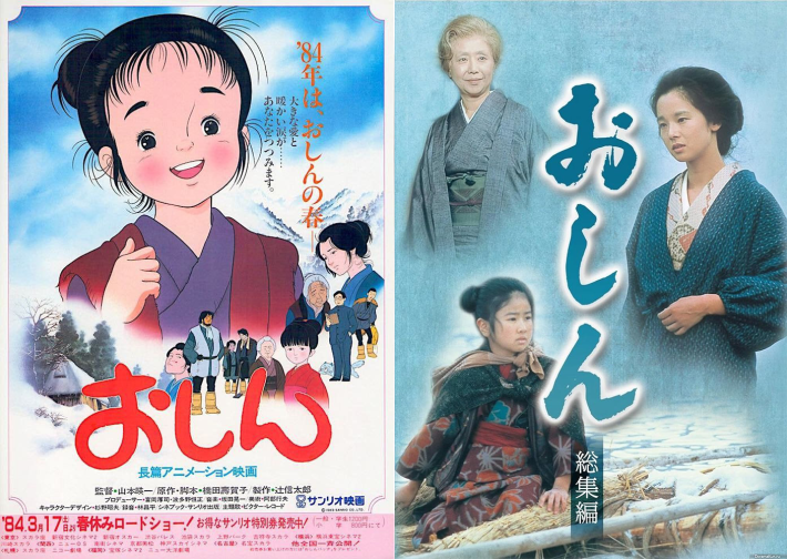 Directed by Belladonna of Sadness director Eiichi Yamamoto, Oshin is an anime feature film that shares a cast and plot with the serialized NHK Morning Drama (15 minute episodes called asadora for short) of the same name. The serial begins in the spring of 1983 and follows a grandmother who runs her family’s local regional supermarket chain on the opening of its 17th location. Yet during the big day she leaves and heads mysteriously north to the mountains of Yamagata. Eventually the story shifts backward in time to her remembering her youth, and it is this flashback that Sanrio’s Oshin takes as its source material.