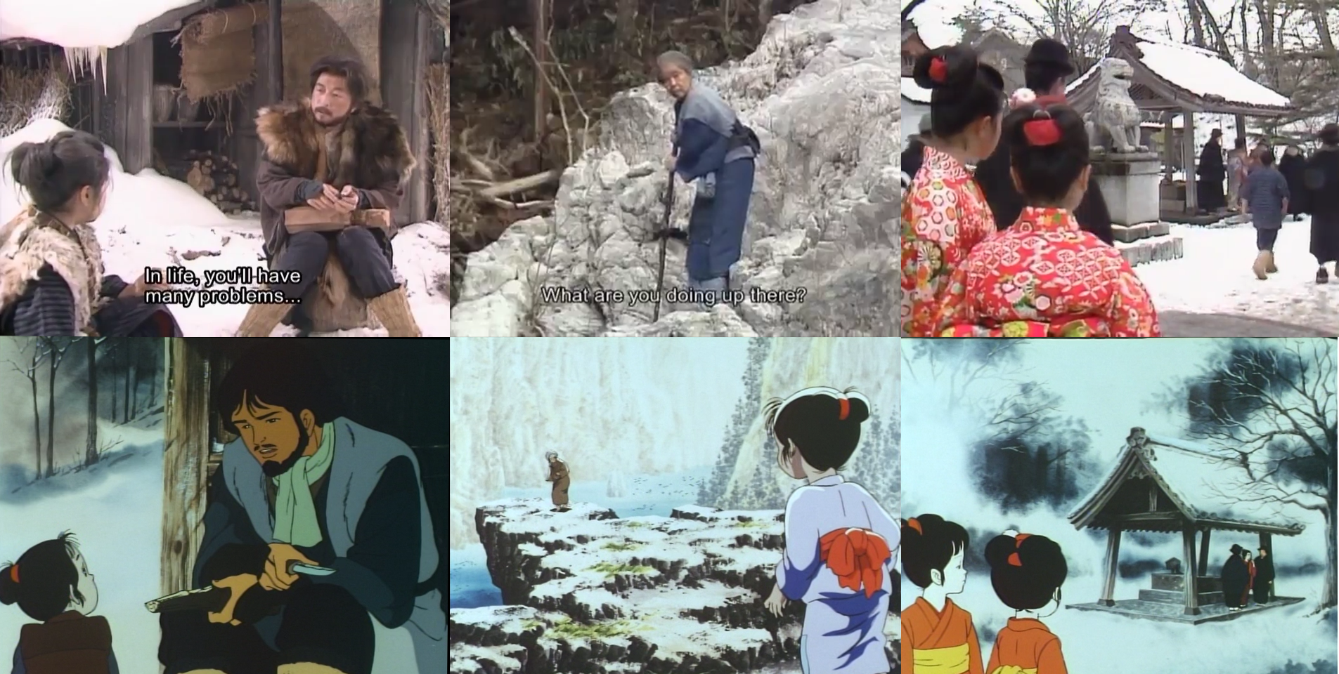 Though the Morning Drama of Oshin has been translated and uploaded, I could not find subtitles for the animated movie and had to resort to machine translation, context from the subtitled show, and what Japanese I know. In that light, it’s hard to give me a fair assessment of the movie, but narratively it’s a very direct adaptation of the show: a slow, maudlin drama about a poor daughter of a sharecropper family persevering through various trials and tribulations in Japan through the Meiji era, a narrative about the resilience of women by a woman. While not a showpiece, it isn’t poorly animated; many of the backgrounds in particular are breathtaking. That said, the anime does not use the medium’s strengths well, and has the pace and plotting of a Morning Drama turned into a cartoon. It does a good job at summarizing the major beats of the first 36 of the 297 episodes of the show (minus the framing story), and I was able to watch both TV series and movie in different windows and see exactly which scenes matched.