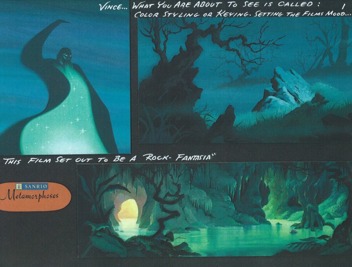 Metamorphoses was supposed to be big. Sanrio had Fantasia-sized ambitions, a theme that repeats itself often, and Metamorphoses was their attempt at creating Fantasia for the rock age. It was a 70mm epic in Panavision-Technicolor with six channel sound and original music by Mick Jagger, Joan Baez and the Pointer Sisters. I can’t get concrete numbers although Variety reported during its production that it cost more than 2,400 million yen or $12,000,000 dollars. It was produced entirely in Los Angeles with 170 American animators, and headed up by Takashi Masunaga (credited simply as Takashi). Masunaga had previously been working as a background artist at Hanna-Barbera, and had come up with and pitched the idea himself. A number of very talented artists worked on this movie, including Ron Dias, a background artist whose work you’ve seen in Dragon’s Lair, Space Ace, and The Secret of NIMH.