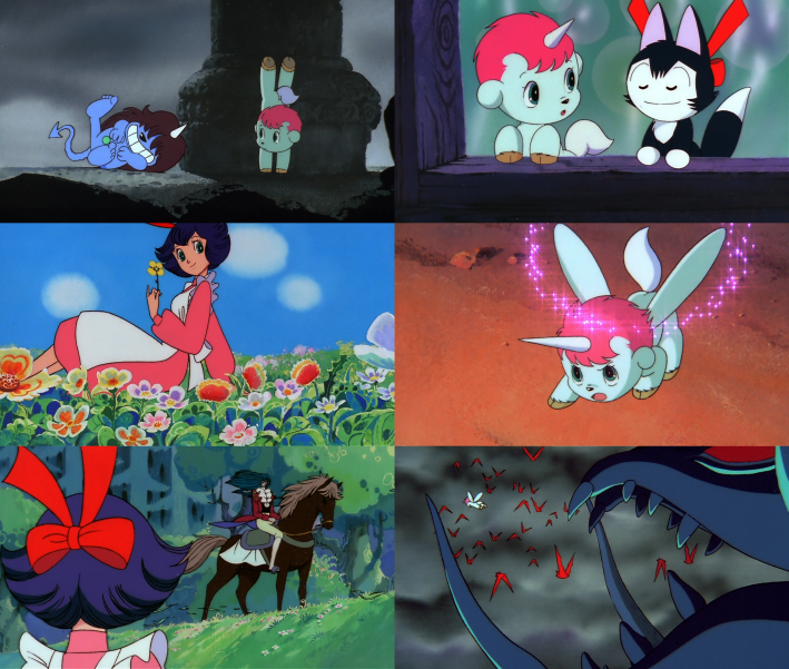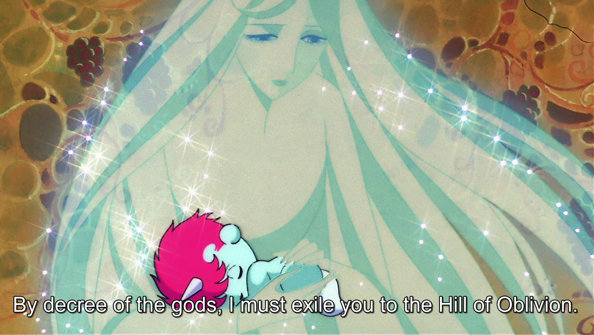 Unico’s backstory, like Metamorphoses, is set against the backdrop of Greco-Roman mythology. In the manga and the first movie, the goddess Venus is jealous of a girl (Psyche in the manga) and orders a femme version of the west wind Zephyrus to take Unico away from her to make her miserable. In the first feature, Venus is simplified to “The Gods,” and their rationale is that Unico makes people happy too easily, and thus should be banished to the Hill of Oblivion. In all versions, the west wind takes pity on Unico, and brings him on various adventures to make people happy. Unico can also transform into a mighty adult unicorn, but only through the power of true love. At the end of every adventure, however, the wind must do its duty and take Unico away, erasing any memory of the friends and people he met. Unico is allowed momentary, fleeting happiness, but cursed by the gods to be unable to hold on to it.