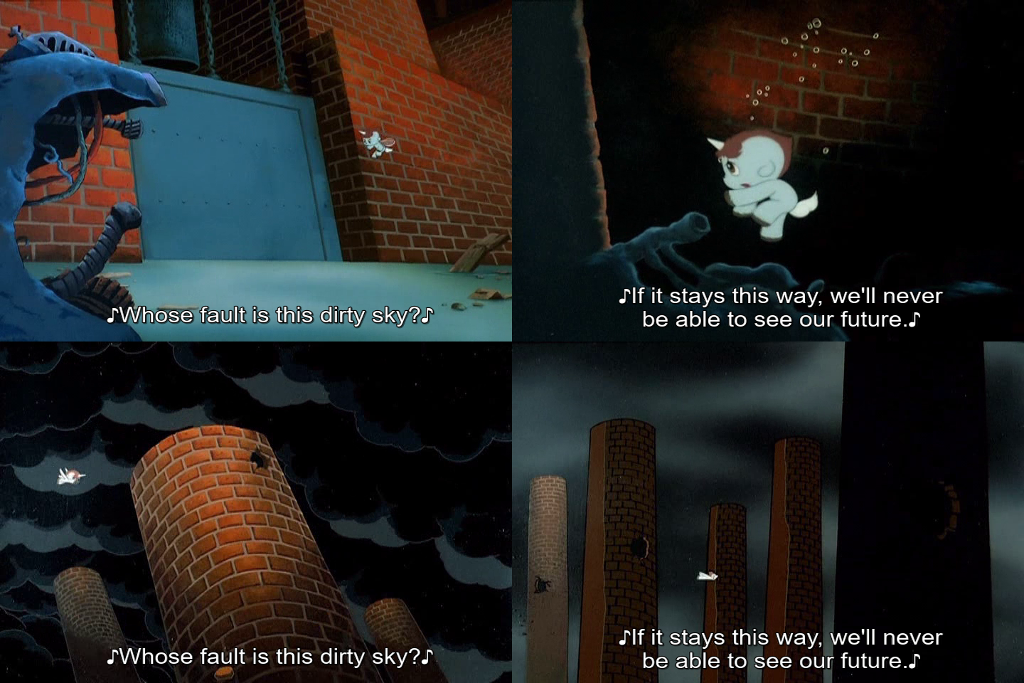 Unico: Black Cloud White Feather was the first of three movies. Originally it was meant to serve as the pilot for a Unico series, but was rejected. It was directed by Toshiro Hirata, who, like many who had previously worked at Tezuka’s Mushi Productions, would eventually leave for Madhouse. The subsequent two films would be produced by Madhouse. Black Cloud, White Feather adapts Chapter 4 of the manga. Unico arrives in a city covered in smog and meets a little bedridden girl who is sick because of a factory that belches smoke. What follows is an environmental story of redemption where Unico destroys the evil factory in an act of ecoterrorism. As the lyrics of the song go: