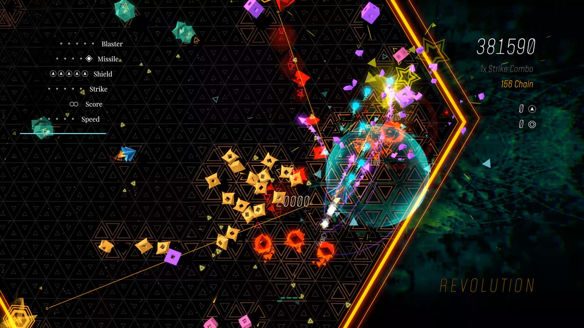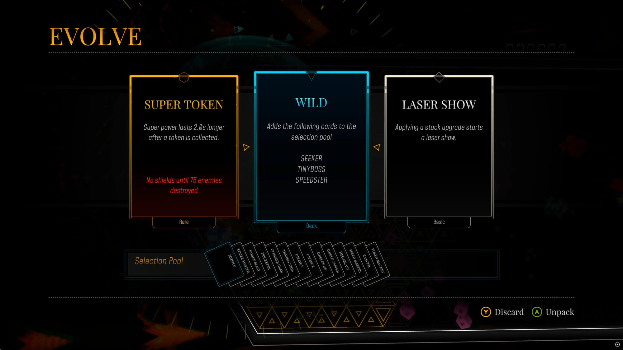 Optimizing around the chaos is the immediate goal: snaking your way through the stages while collecting glimmer and carefully choosing upgrades. In addition to the upgrade stack, there’s also a rarer and more powerful set of upgrades called evolvers that change how your ship behaves, and take the form of card-based upgrades. Certain rare and powerful evolver tokens give temporary penalties, like disabling your shield for 15 seconds or or flooding the zone with enemies, in exchange for significant upgrades.