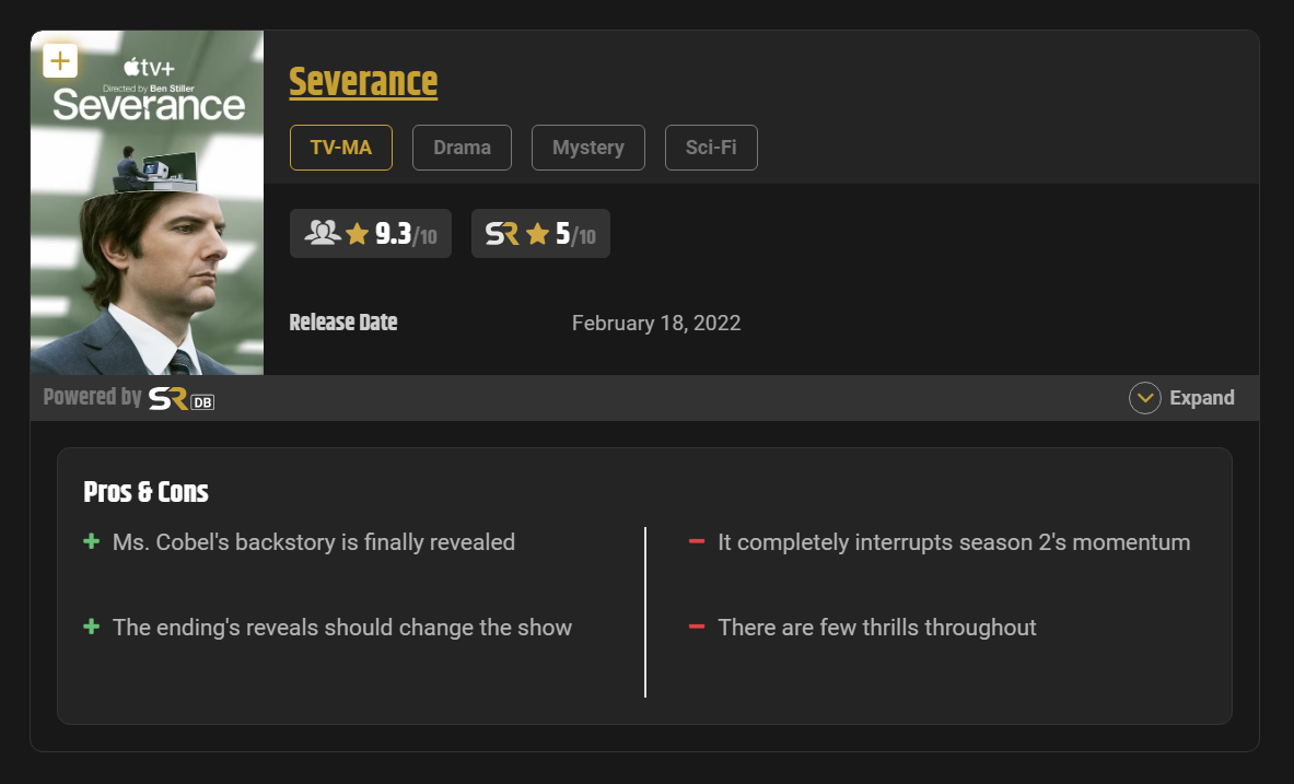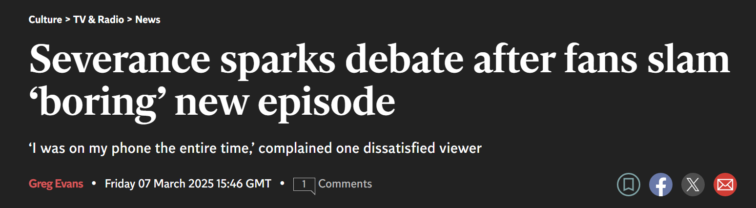 Take last week's "divisive" episode, the eighth in the series, of Severance. An episode where a major character has their backstory completely upended, doubles our understanding of the show's villainous corporation and signposts the future arc of the series' resistance, all in just 37 minutes. Yet despite all that--and I honestly believe this has been caused by the media's click-driven, growing disregard for the beating heart of various artforms--too many websites went beyond just writing some thoughts about the episode, and decided to not only review it as though it was a 37-minute feature film, but make news about what some random people on the internet thought about it.