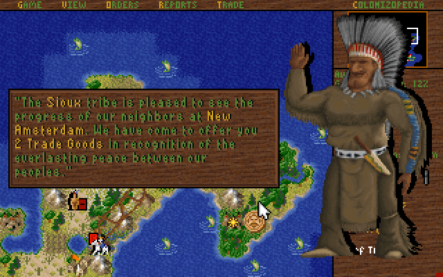 For those who have never played (or heard!) of it: Colonization was released in 1994 on the PC, starts in 1492 and tasks you with choosing to represent one of four imperial European nations--England, Spain, France or the Netherlands--then setting forth to found new colonies in the new world. It is, superficially, a game very much like Sid Meier's more famous series, Civilization, in that you drop guys on a map, build settlements and dig roads and fields between them, but with one notable difference: in Colonization you are controlling a nation of individual guys.