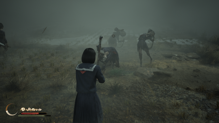 Fog is never simply fog in a Silent Hill game. Whenever those roiling clouds draw in close, whenever a character finds themselves trapped somewhere, it is because they have trapped themselves. In a game like Silent Hill 2, the deep fog throughout the titular town is a symbol of protagonist James Sunderland’s delusions about his role in his wife’s death. The fog-filled field here in Silent Hill f is a place that Hinako wants to remain. These are the fields she played in with Shu as a child, and as long as she stays here, she doesn’t need to confront her relationship with her friends or the terror she feels about her impending marriage. In these fields, if she could remain, it might be possible to pretend everything is fine. But there are no “real” people here. There are only straw mockeries with false faces. Seeing beyond them means getting close.