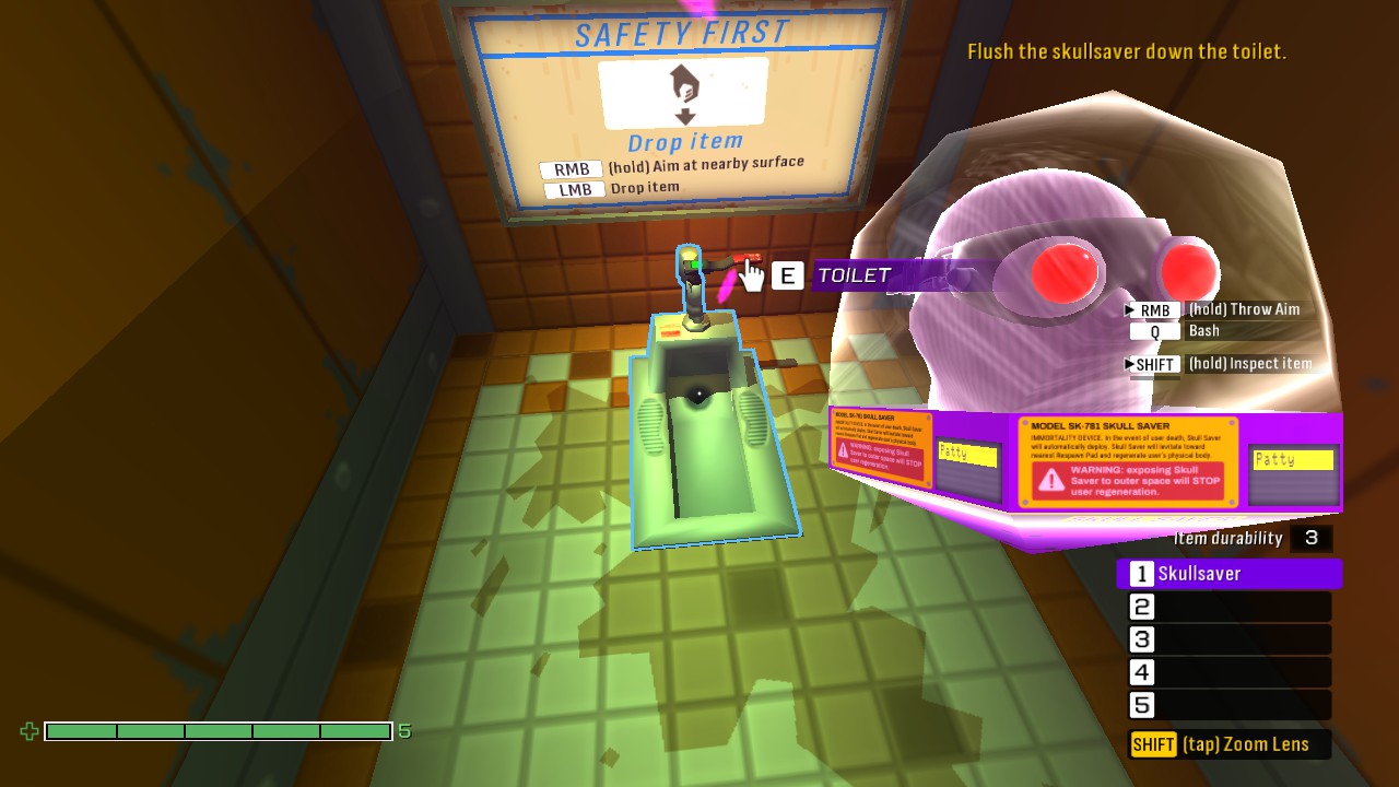 I throw a couple bars onto the ground, producing sudsy bubbles and causing the guard to slip and fall. I rush out to finish her off, only to… also faceplant as a result of my self-made slip ‘n’ slide. The guard opens fire, and I roll into a nearby vent with just a sliver of health left. OK, I think, this isn’t going great, but I still have options. As I linger in the vent, a meter fills telling me that I will soon sneeze – not great for stealth – but that gives me an idea. Earlier I picked up a container full of black pepper; I barge back into the laundry room, take aim, and throw it at the guard, who begins sneezing and wheezing. It’s now or never. I leap onto her back and wrestle her onto one washing machine, followed by another. That leaves her down for the count. Then, of course, I pop her head off nice and clean and throw it out the airlock. You know, so she can’t levitate over to a new body. Another job well done.