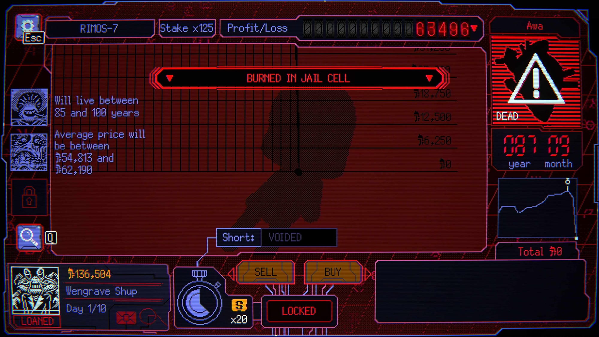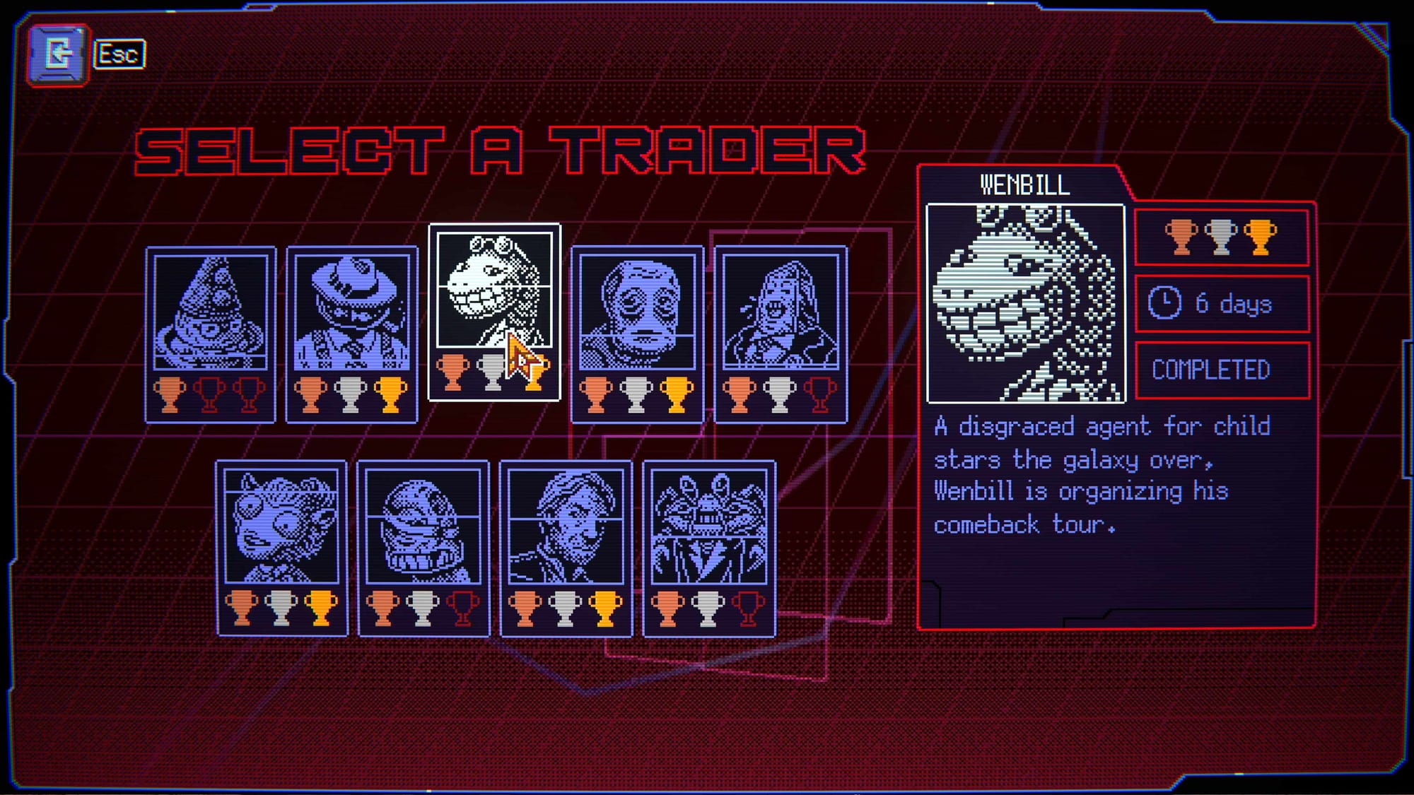The campaign features nine distinct characters and scenarios representing different traders. The plot of each character adds a significant mechanical tweak to each trading period, with four distinct outcomes to each scenario: failure, bronze, silver or gold. For example, trader Holmit Miskie is a disgraced junior financial planner at Holmit & Spawns whose elderly clientele wishes to get in on the new baby trade, a market his bosses are not confident in and thus are setting him up for failure. He is a sad sack who looks like the alien equivalent of Jack Lemmon in Glengarry Glen Ross, and mechanically he is not allowed to take side bets. Nuria Voll is a retail trader who puts their rent and everything they have to get into the lucrative baby trading market. Mechanically, she is scammed every day by the lease on her “HiValue Guaranteed trade license” and enters the market just as the entire thing goes to shit in what’s known as “The Great Flip.” Mechanically, the market gets twice as expensive and half as profitable halfway through her run. Rep. Hoddle is a legislator who regulates the market, and thus is not allowed to interact with it, save through an intermediary named Willy “No Hands” Shig. Mechanically, this legal loophole of an unscrupulous proxy adds a significant delay to every purchase and sale, making it harder to trade on volatility.
