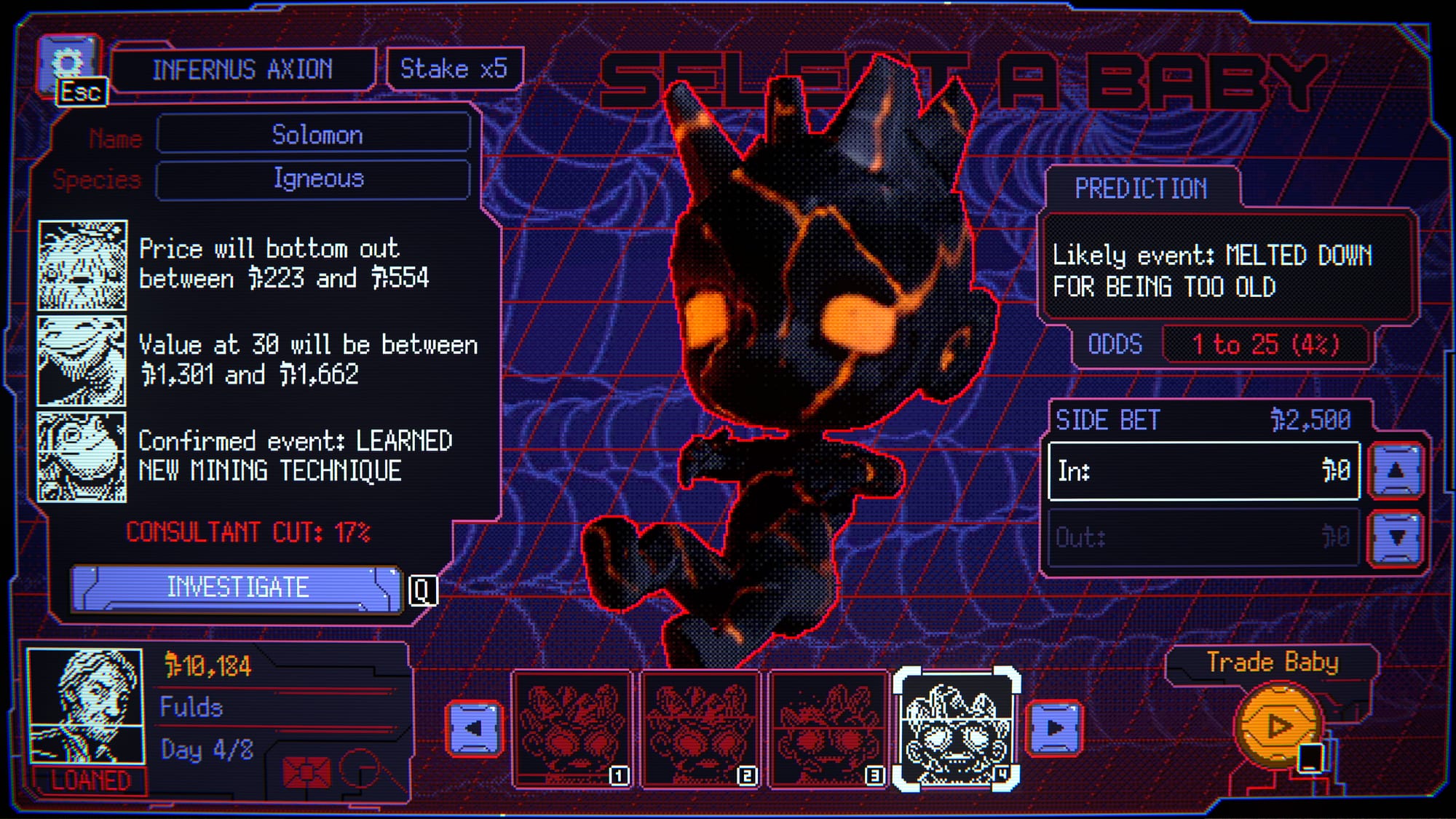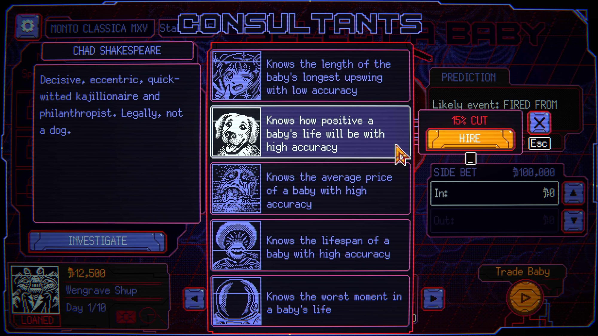Assisting in your buying and selling are advisors, who can lend insight into the lives of each baby for a fee with varying degrees of accuracy. Details range from the average price of the baby, the value of the baby at age 30, the floor price of the baby, random events in the baby’s life, the longest duration of its positive upswing, and so on. Advisors are key to making money. For example, if you know the average price of a baby is about $3,000, and the baby has been trading below that for several decades, you know that it will have to swing upward above $3,000 for a specific period of time for the overall amount to average out. Occasionally, the knowledge of the advisors will sometimes intersect with the side bets, allowing you to make smarter calls on which baby will pay out aside from the general odds given by the bookies.
