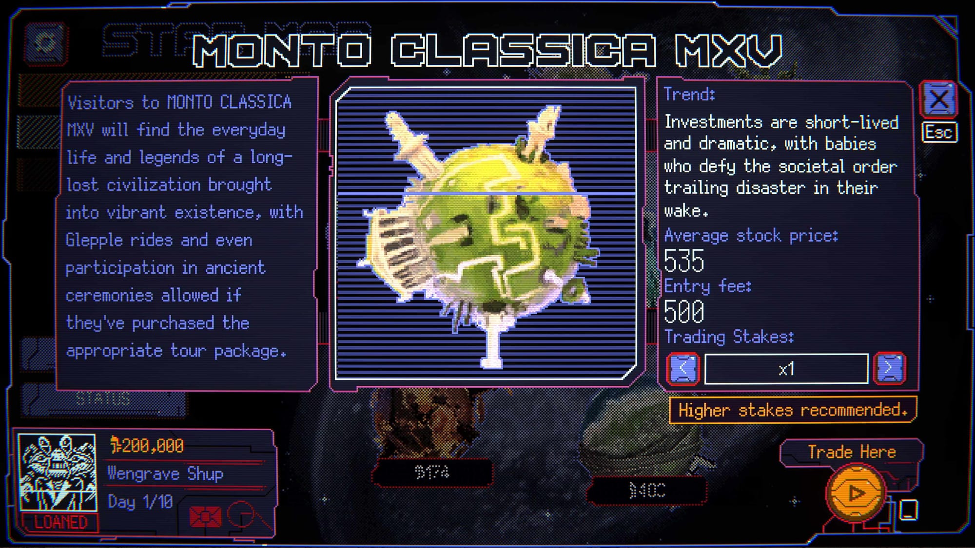 In addition to this, there are seven different planets you can trade on, each of which have wildly different market tendencies for the babies on them. For example, Google Gibby is a “war world,” where half of the planet is permanently in conflict to benefit the arms industry. This constant state of war means that baby investments tend to trend steady upwards before the baby’s life turns reliably horrible, often for war-based reasons. Cantor Vantis, meanwhile, is a tropical reality tv show planet where galactic children are sent to compete on the show “Get Big or Die Trying,” and which can lead to sudden fortunes before sudden, comically