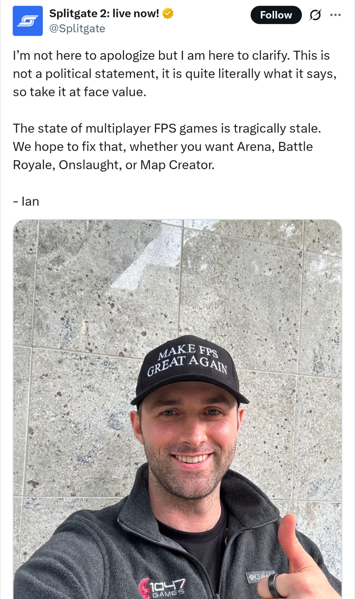 Also worth noting, in case you were wondering about the black hat, a colour choice made popular during the 2024 election campaign by Elon Musk:
