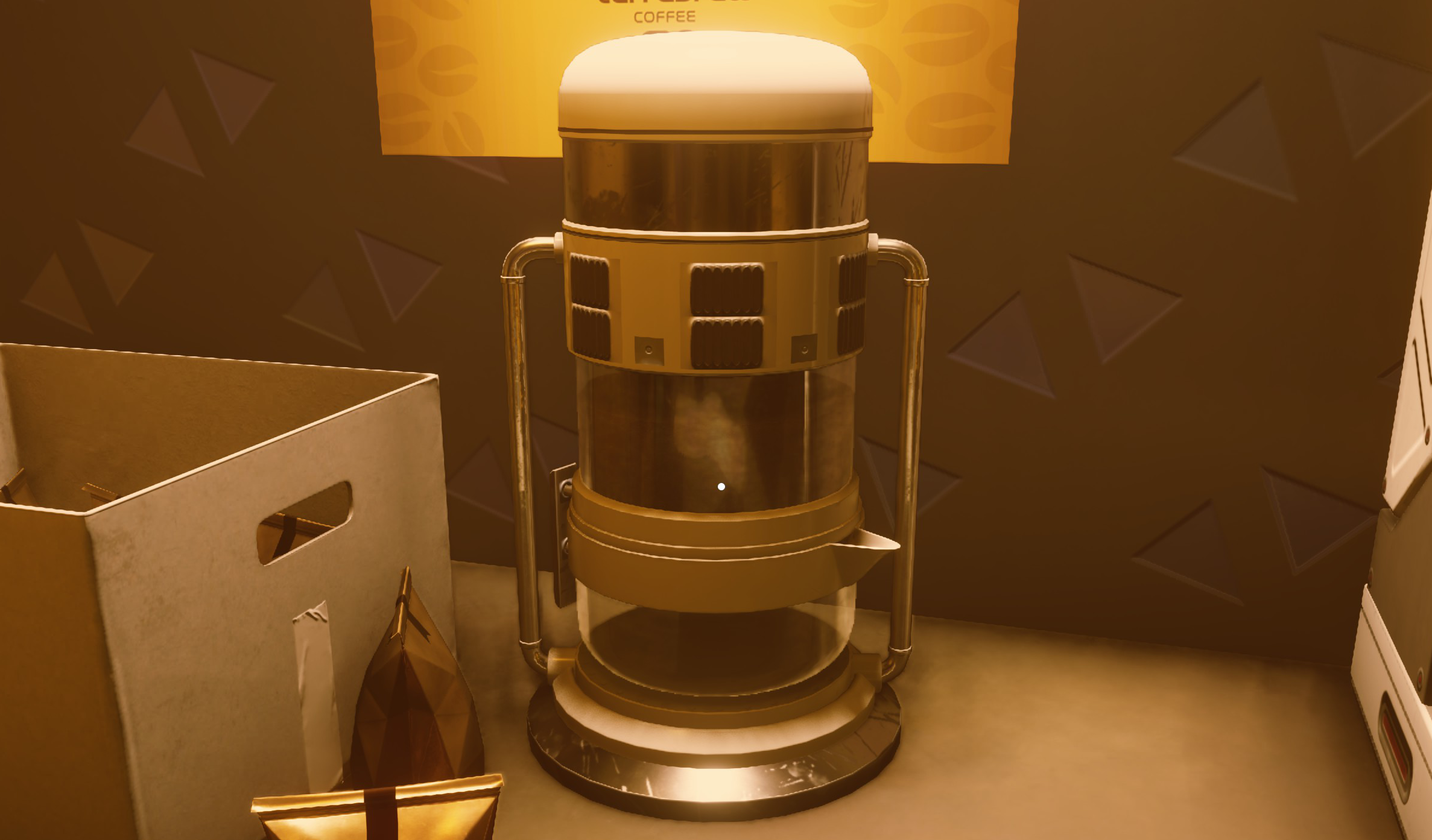It's fine, I guess. It's a drip coffee machine, you can't really fuck that up. Coffee brews up top, it drips into the glass carafe, anyone who has been to an American diner or workplace in the last 50 years will know the deal. Anyone who hasn't should know this is the worst possible way to enjoy coffee. In most of its applications it tastes like someone pissed in an ashtray then set it on fire. And while there are specialist, delicious exceptions to this, I don't think that's what the art team was going for here. This is clearly Starfield's "terrible office coffee", it looks as much, and in nailing that brief it's by far the most accurate and successful exploration of a coffee-related theme in this universe. It would probably make terrible coffee, and make everyone who drank it miserable, but that's the point.