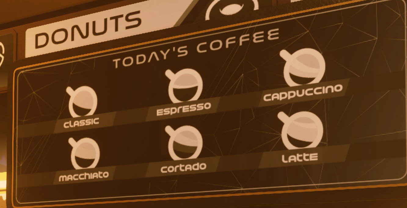 That is a good guide! Starfield's is not. Its ratios and components are all over the place, and it's very difficult on the eye to see a side-on depth comparison depicted from a top-down perspective (looking down into a cup), like the coffee and milk has been inserted in vertical slices. If anything the visual aid makes ordering even harder than it should be, as though it's intentionally--in a nod to the extreme optimisation and misdirection capitalism must be excelling in by the 24th century--shepherding customers towards simply giving up and ordering the "classic", the only coffee they actually know how to make quickly and to scale. Like the espresso machine's design, it makes me wonder if some artist, somewhere along the line genuinely knew what they wanted, but the orders passed through enough sets of misunderstanding ears that the final product is just completely wrong.
