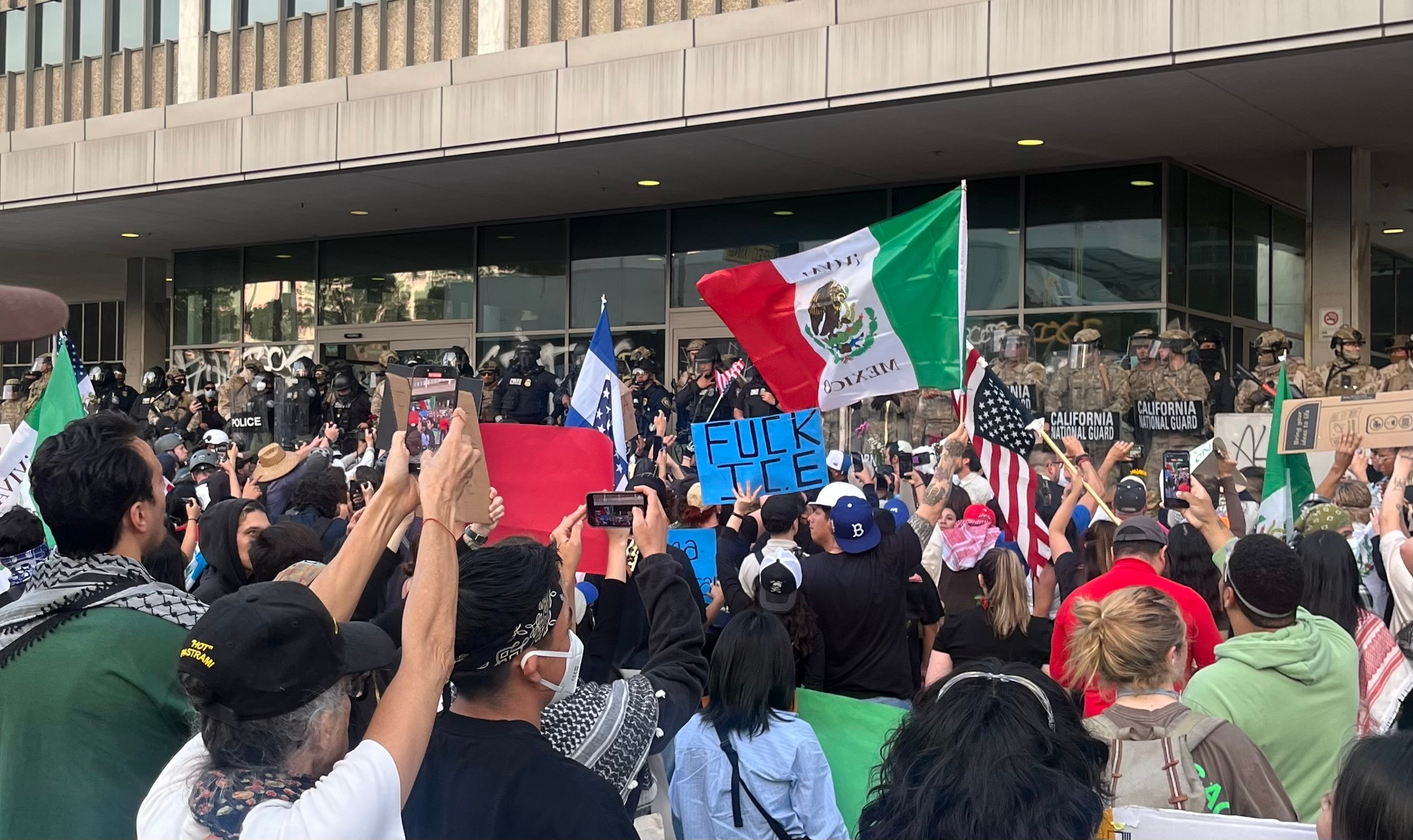 When I arrive at downtown LA’s federal building, the location where crowds have been convening for the past couple days, I’m stunned at how few people are present. A small handful of protesters and reporters mill about while a tiny woman, voice bolstered by the great equalizer that is a megaphone, shouts at 15 or so National Guard troops guarding the building’s entrance. I feel secondhand embarrassment even though I know I shouldn’t, if only because I can’t stop imagining how awkward that same scenario would be if I was in her shoes.