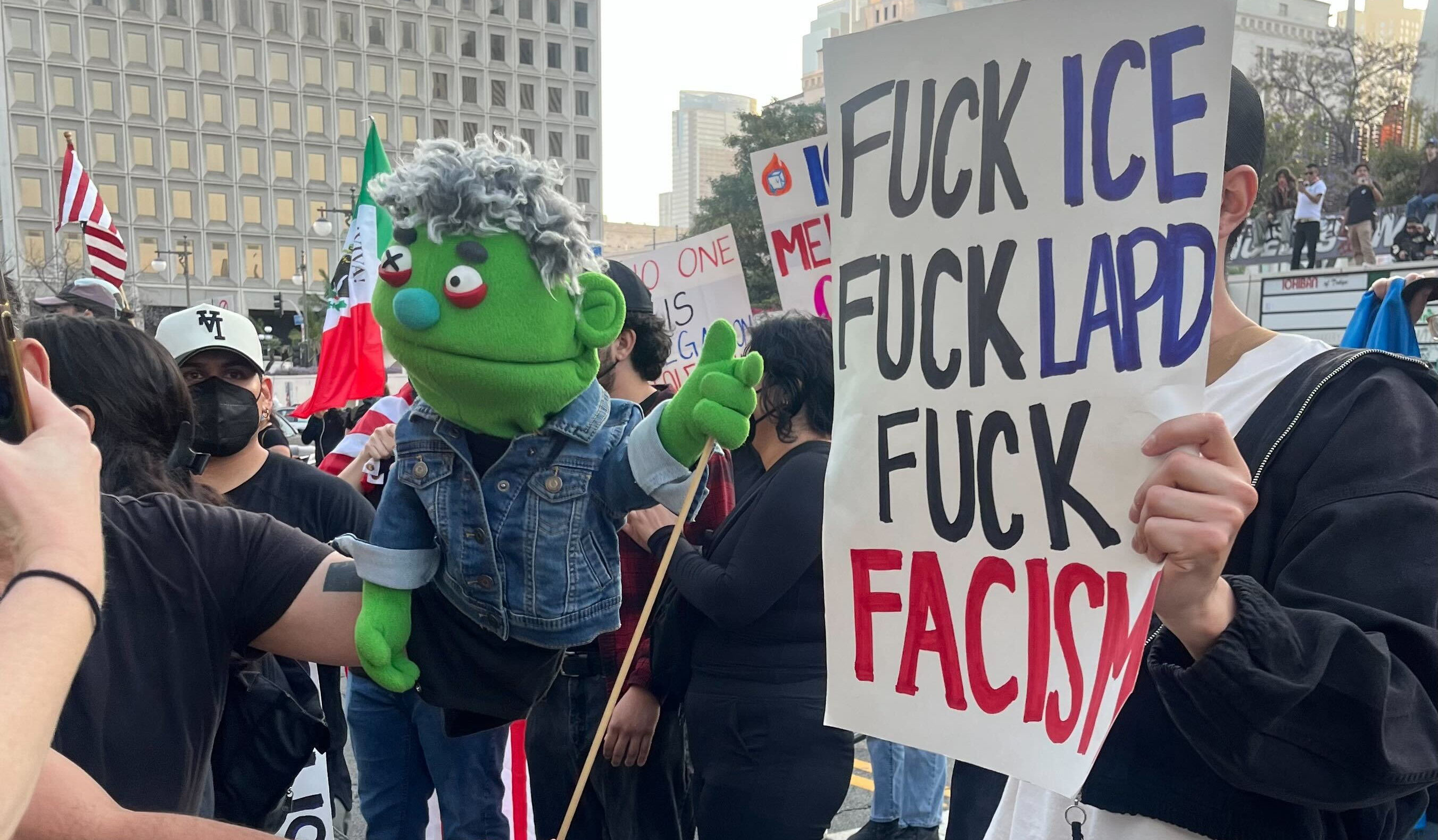 The summer sun beams as a crowd, walking in something that would resemble a line if observed from outer space, snakes down a Los Angeles street. It’s so long that I can’t see its beginning or end. As far as my tired eyes can tell, it just goes and goes until, off in the distance, it meets the horizon. Some people carry signs lambasting ICE and Nazis; one has Hello Kitty waving a Palestinian flag on it. Other protesters run the gamut from looking like they stopped here on their way to brunch to wearing full costumes. There is a Labubu cosplayer holding an anti-ICE sign atop a bridge. Social media quickly declares them a hero.