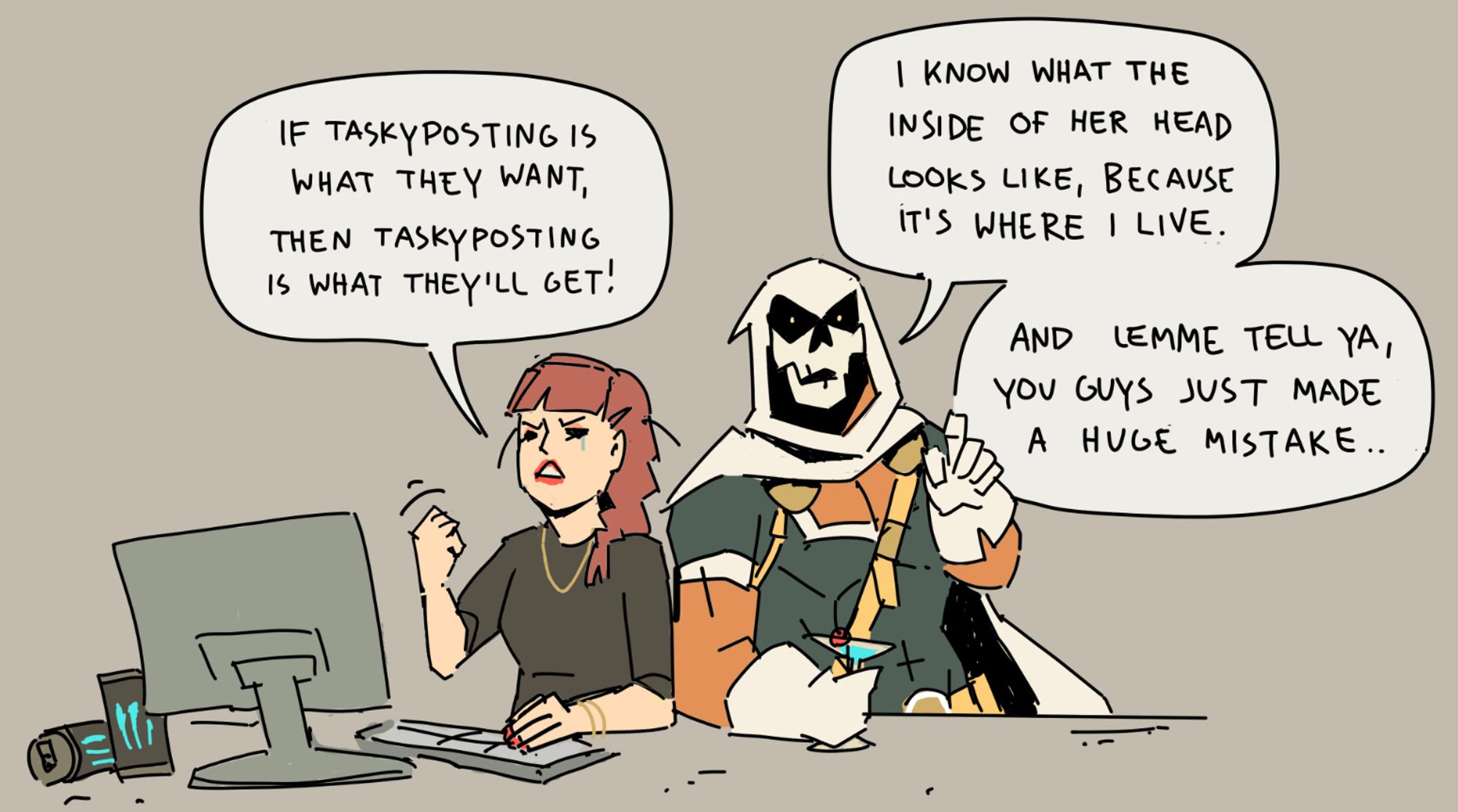 I am a person who doesn’t like sharing much personal information about me and my life online, so Taskmaster has become a welcome tool to give me something to connect with my audience and chat and meme about, especially during times when I am too busy to produce a lot of new art. And I genuinely do love the character, even after all these years. So it simply brings me a lot of joy.
