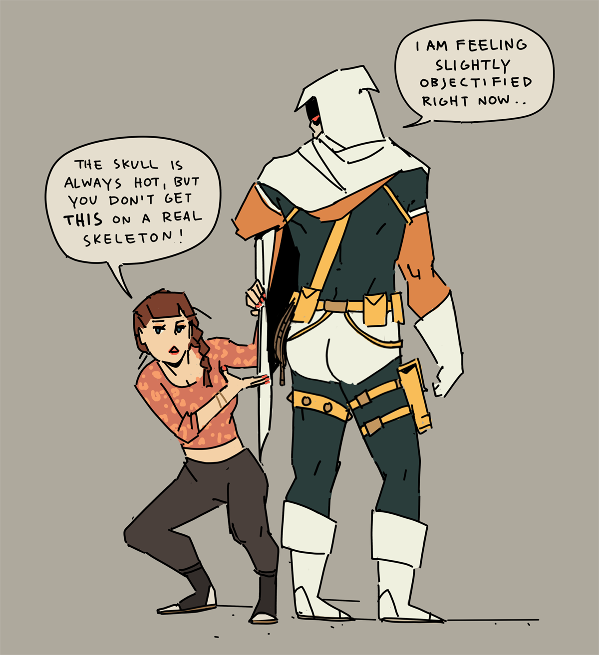 KH: Hah, why not the amazing, handsome, hot skull-man in the white underpants outside his pants!