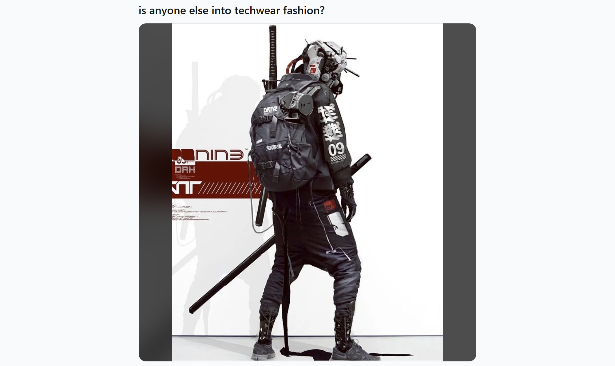 Think cargo pants with 17 pointless straps hanging off them, sci-fi face masks that look physically impossible to wear, jackets covered in big kanji characters. Google "techwear" right now and the image results will give you page after page of bad Cyberpunk 2077 cosplay, loads of kids dressing like they've been conscripted into a war against the machines.
