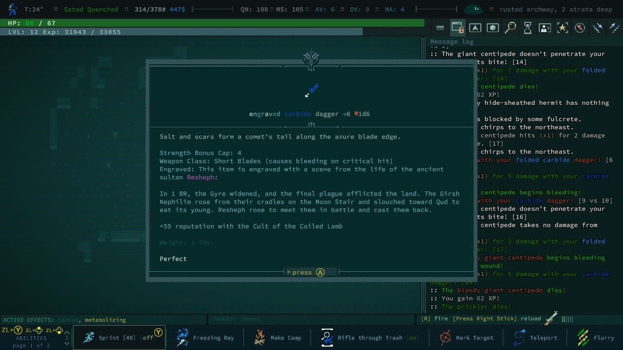 I have been gallivanting across Qud with my four electric daggers, basically melting everything in my path. The one major issue is that the electric arcs from my dagger often also kill other random animals in the area, meaning I’m still fucking dying to like, an angry horse. Roleplay mode makes trying things out and exploring a little less intimidating. There’s a part of me, though, that sees how bizarre and interesting the game can get when you let its systems crash into each other, and wants to just start a new character anyway.