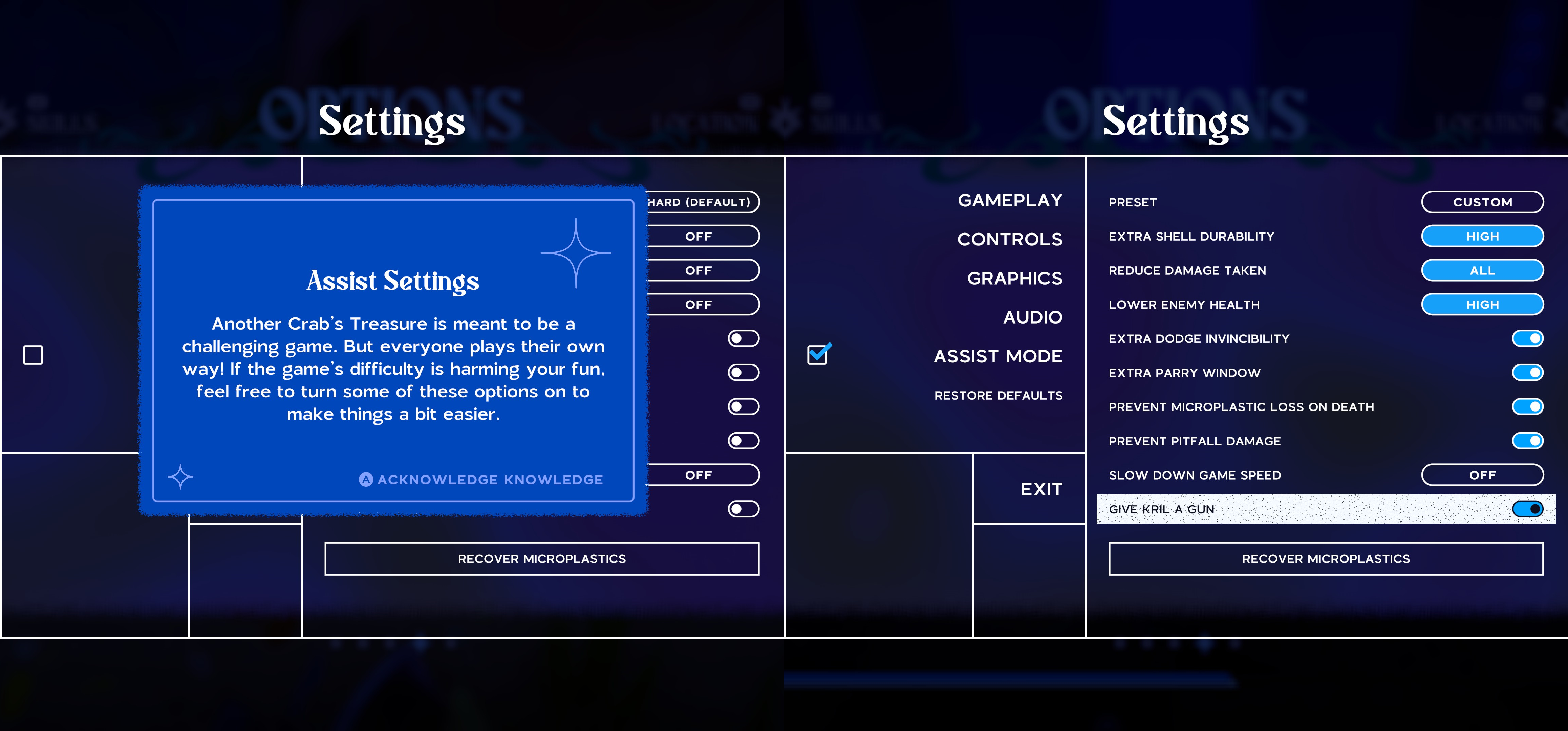 Buried in the options of ACT (which, admittedly, also have some more traditional difficulty concessions) is a check box. Tick it and suddenly your crab has a gun. A huge gun, a novelty cheque-sized gun, a gun so big it dwarfs the character and kinda breaks some of the game's animation. More importantly, this gun can instakill anything you point it at. This makes the game easier, I will grant it that, but that's not really the point. The point is, like we saw with Control--which also has a similar option, albeit without the comedic absurdity--using it bypasses the idea of difficulty entirely.