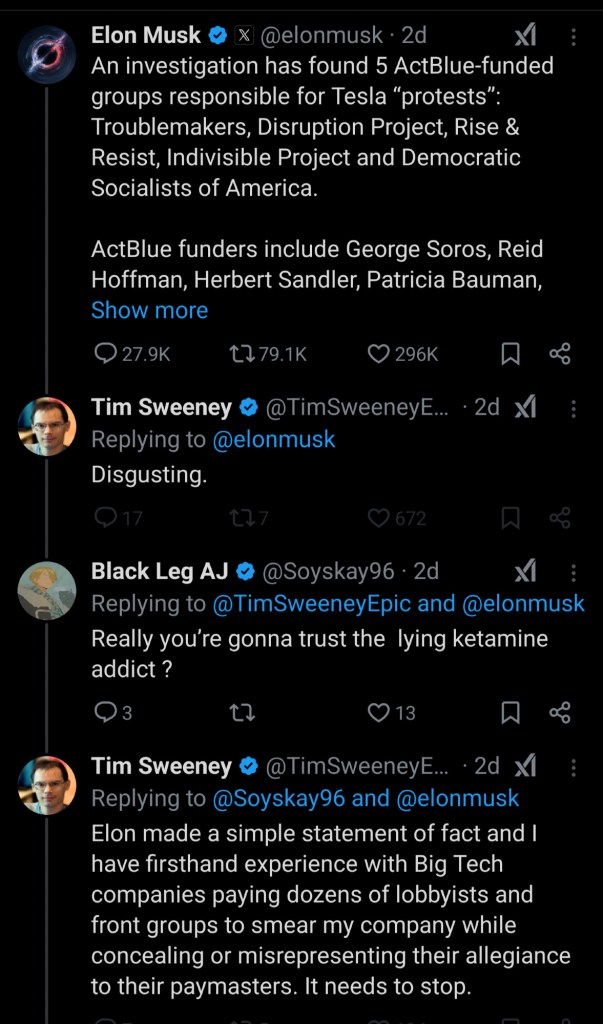 Here is Sweeney, the boss of the company responsible for Fortnite and the Unreal Engine, pillars of the video game industry, agreeing with an overtly conspiratorial and openly racist post from the most unloved person on the planet: