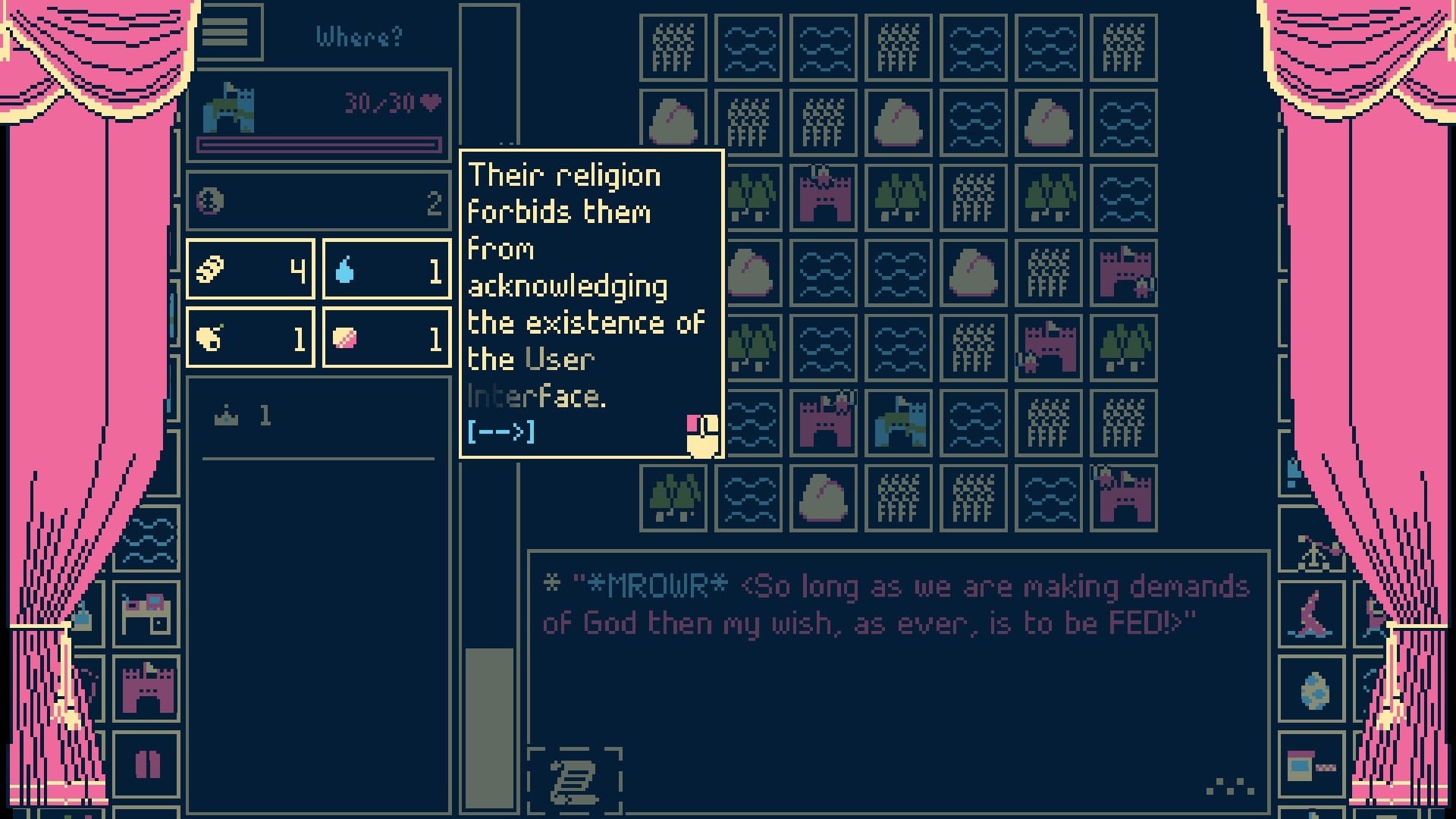 Layered atop all this is moving your kingdom along a roguelike map that even the game admits is confusing as hell, trying to make it to some kind of exit. And surrounding all that is the narrative element, which frequently breaks the fourth wall and is full of surreal jokes, talking cats, and a seeming conflict between the in-game narrative and the demo’s tooltips.