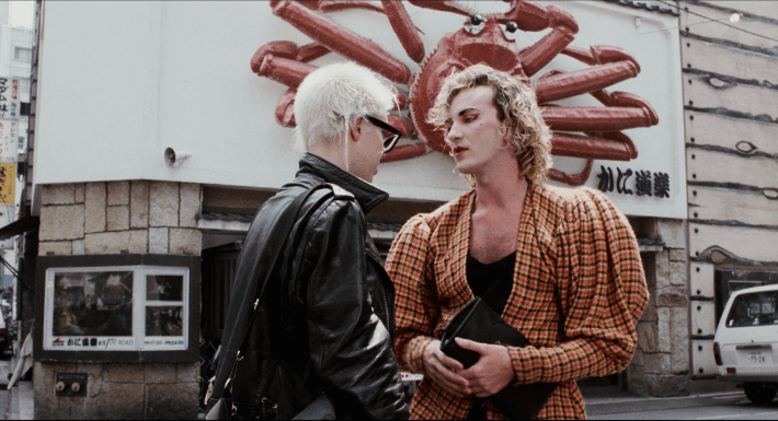 Such verisimilitude is a rare feat now, let alone in a goofy romcom from 1988. If it had absolutely nothing else going on for it, Tokyo Pop would be worth watching just for the sheer number of gorgeous shots of 1980’s bubble economy Japan: beautiful neon lightscapes, the iconic, massive mechanical crab sign of the chain Kani Doraku, the iconic chef sign of Kappabashi, shots of Rockabilly dancers in Yoyogi Park, even a shithole, rundown Japanese Dunkin’ Donuts that you can smell through your TV. Adding to this are tiny little cameos by X Japan, tiny indie acts like Kotogawa Rin Making Love and Papaya Paranoia, and wrestlers Bull Nakano and Aja Kong. Hell, even the brief section set in New York City’s East Village feels true to the time, proven by the fact that Keith Haring hand drew the logo and opening credits to this movie (director Fran Rubel Kuzui and her husband Kaz Kuzai helped Haring establish the Tokyo branch of his Pop Shop in Aoyama).
