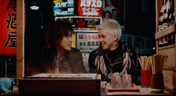 Tokyo Pop tells the story of a young punk named Wendy (played by Carrie Hamilton), living down and out in New York’s East Village in the 1980s. She gets an invite from a friend living abroad in Tokyo to come and visit, and having no prospects, a failing band and a shitty boyfriend, leaves with no plan and barely any money. She arrives to find that her flaky friend has already booked it, stranding her in Japan and forcing her to take gigs at a hostess bar to make enough money to survive. Along the way she meets Hiro, wonderfully played by Diamond Yukai, an unsuccessful rocker in a failing band who is avoiding taking over the family’s food model business. Hiro, after misreading both some cues and some English, invites her to a love hotel with goofy consequences. The two eventually reconcile, fall in love, and she joins their band as a singer. The novelty of a band fronted by a foreigner propels the band to flash in the pan fame, but in a way that complicates their relationship and unearths the complexities of Wendy’s place in Japan.