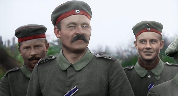 They Shall Not Grow Old is difficult to stomach, with the soldiers being motion interpolated in a melting, shambolic manner. The digital noise reduction is inconsistent – film grain is present on the skin of soldiers and absent in other places, following their faces like reptilian scales. This is an enthusiastic, clumsy use of a technology on severely damaged footage.