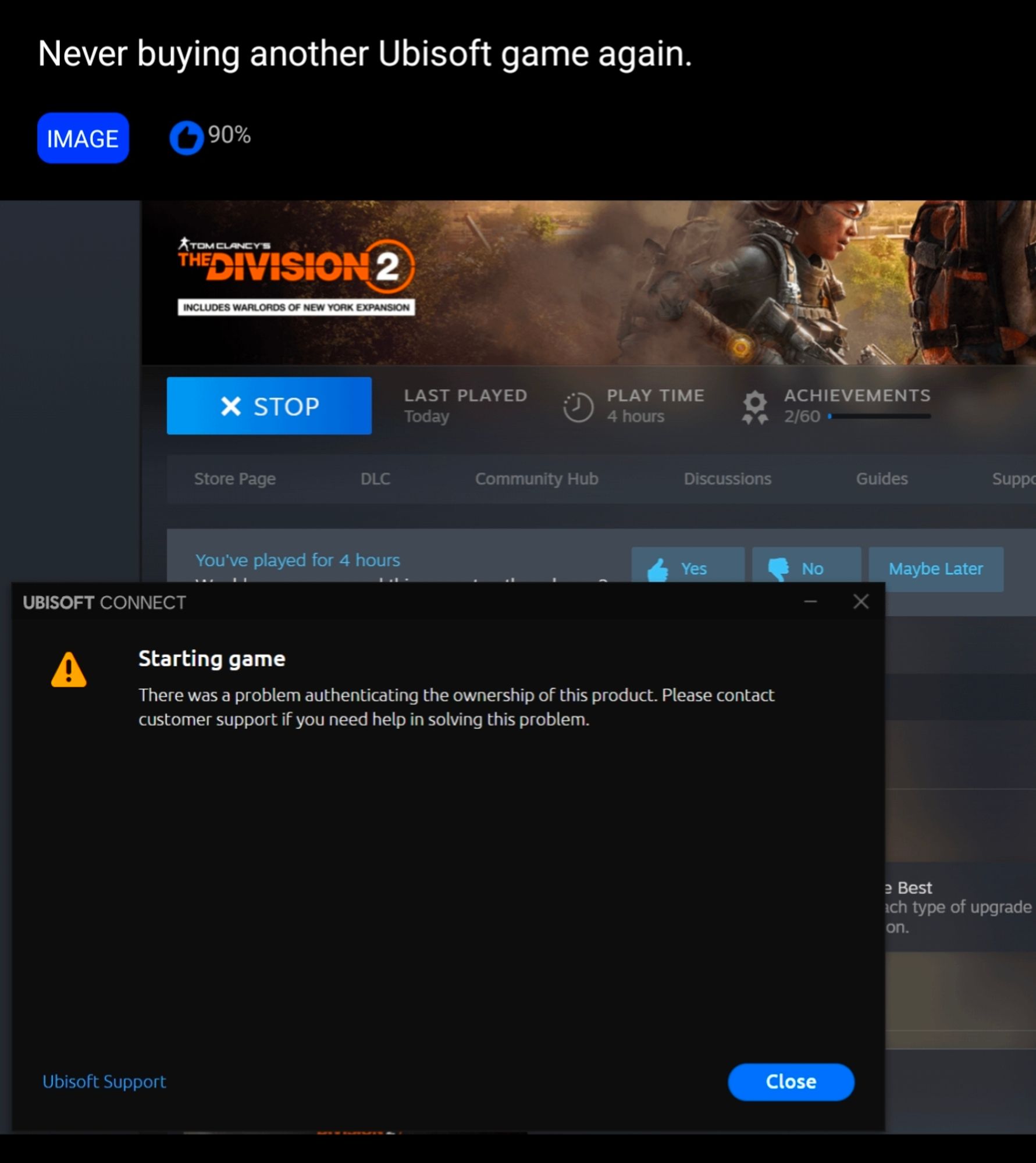 And yet. In a best case scenario, waiting for Steam to boot a game then having to wait for Ubisoft or EA or Rockstar or Paradox or whoever's launcher to load after it, then having to click play again just so we can play the game we already clicked play on in Steam is a pointless waste of time. At worst, like we see above (or like I've personally experienced everywhere from trying to play Star Wars Squadrons in VR to a recurring Europa Universalis IV bug that makes the game unplayable), the extra load (and introduction of extra variables where shit can go wrong) can straight up break your ability to play a game at all.
