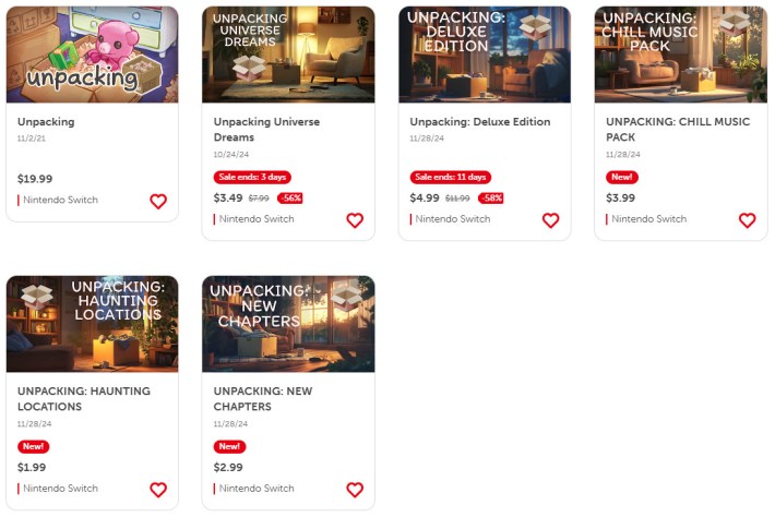 On the top left is Unpacking, which is a very good video game. The next five games are most definitely not Unpacking, even though their key art makes them very much look like it. They're not made by the same team, they're not continuations or sequels, they're just some slop--seemingly using AI art on the thumbnails, no less--made to try to cash in on the established game's brand.