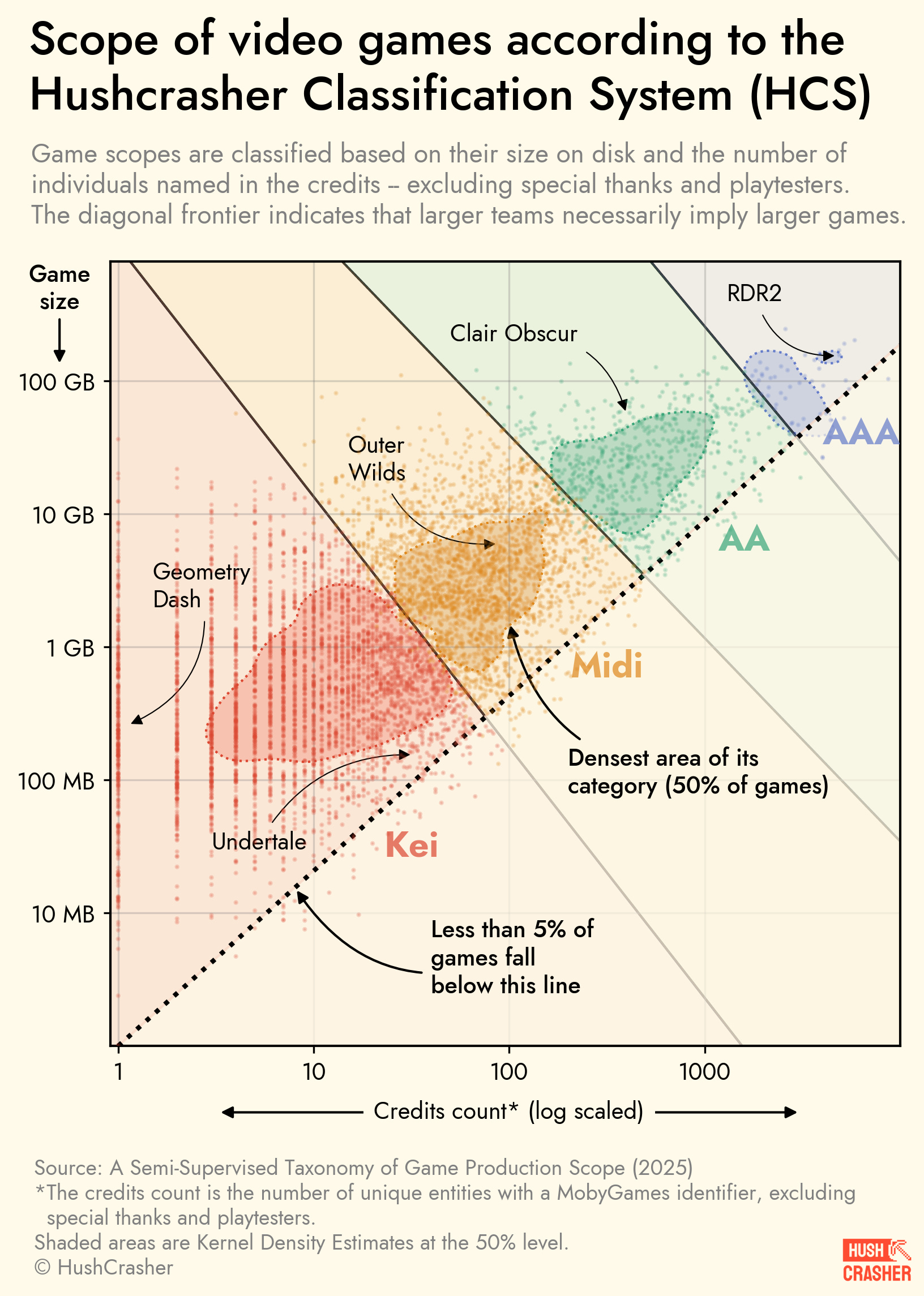 Eschewing the idea that you can classify a game's development scale by "vibes" (which I don't necessarily agree with, as vibes are ethereal but also important) they instead, for the sake of being able to express this through data, looked at a whole bunch of games and sorted them according to a variety of factors, with two emerging as the most important: their size (in MBs) and the size of their credits list.