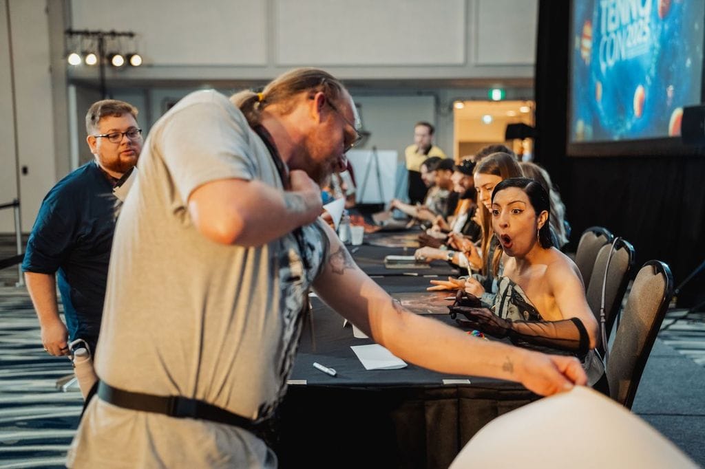 As people were leaving the venue, Bryan and Michael approached Ford and Everett and asked if they could take a picture with them. The two duos proceeded to talk for a bit and hit it off—coincidentally all being from Canada—at which point Ford and Everett invited Bryan and Michael to TennoCon, the annual Warframe convention in London, Ontario.