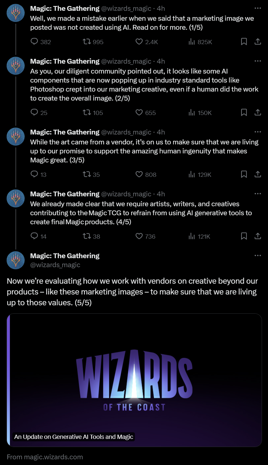 Last month over 1000 employees at parent company Hasbro were laid off, and many of those were at Wizards of the Coast. One of the areas hit particularly hard was...the art department. Maybe one of those experienced human beings could have helped here? Maybe one of them could have hired a human artist for this work and saved all the trouble? Or at least skipped the "we stand by our previous statement" part and got straight to the "we made a mistake" part.